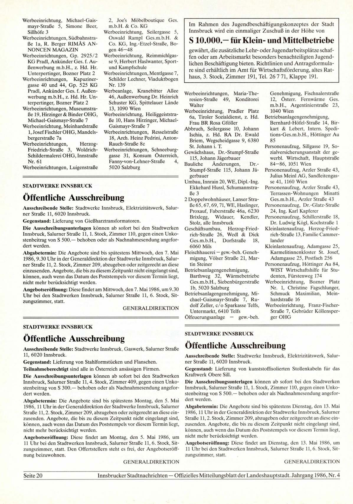 1986, 9.30 Uhr in der Generaldirektion der Stadtwerke Innsbruck, Salurner Straße 11,2. Stock, Zimmer 209, abzugeben oder zeitgerecht an diese