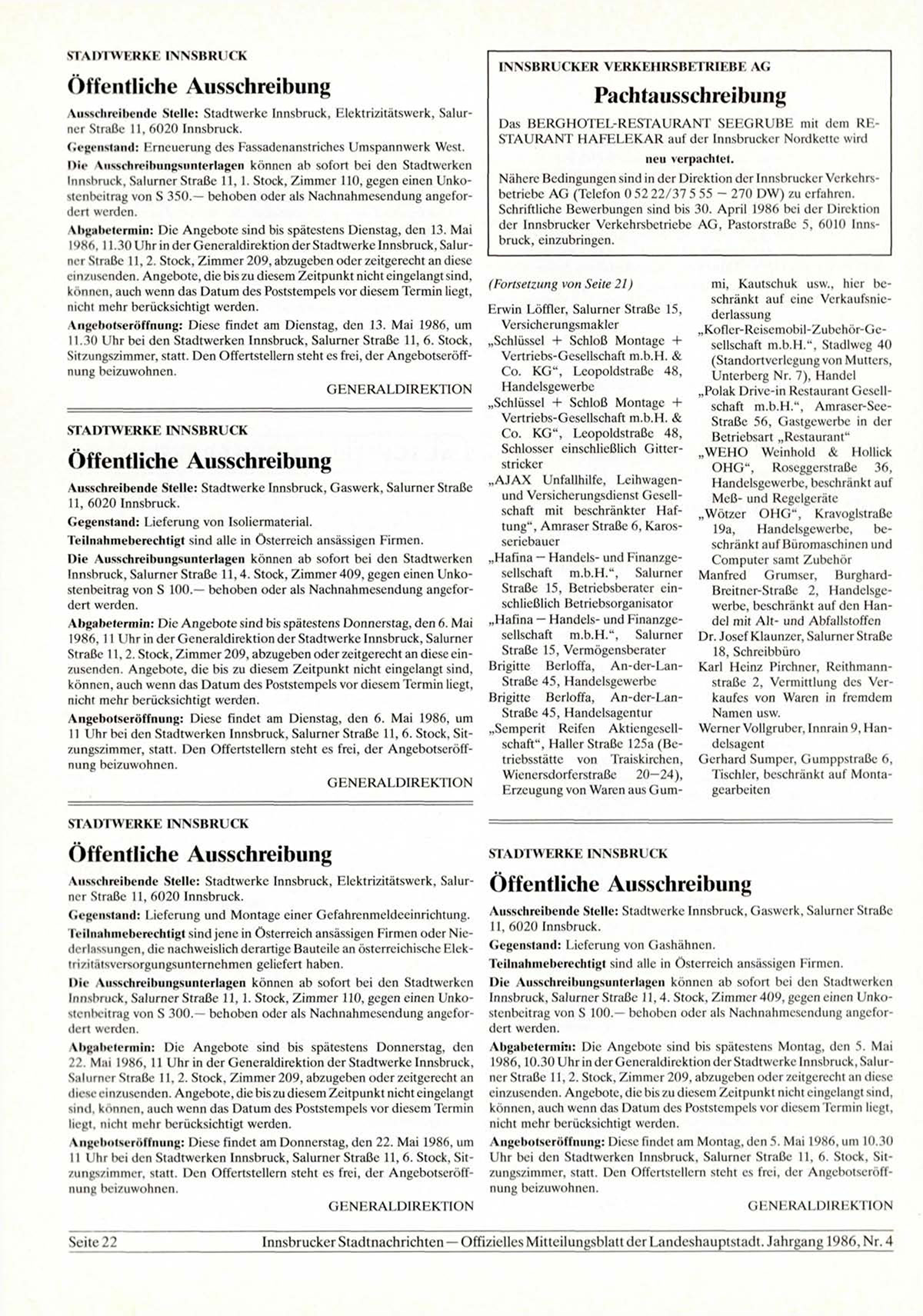 1986, 10.30 U h r in der Generaldirektion der Stadt werke Innsbruck, Salurner Straße 11,2. Stock, Z i m m e r 2 0 ° , abzugeben oder zeitgerecht an diese