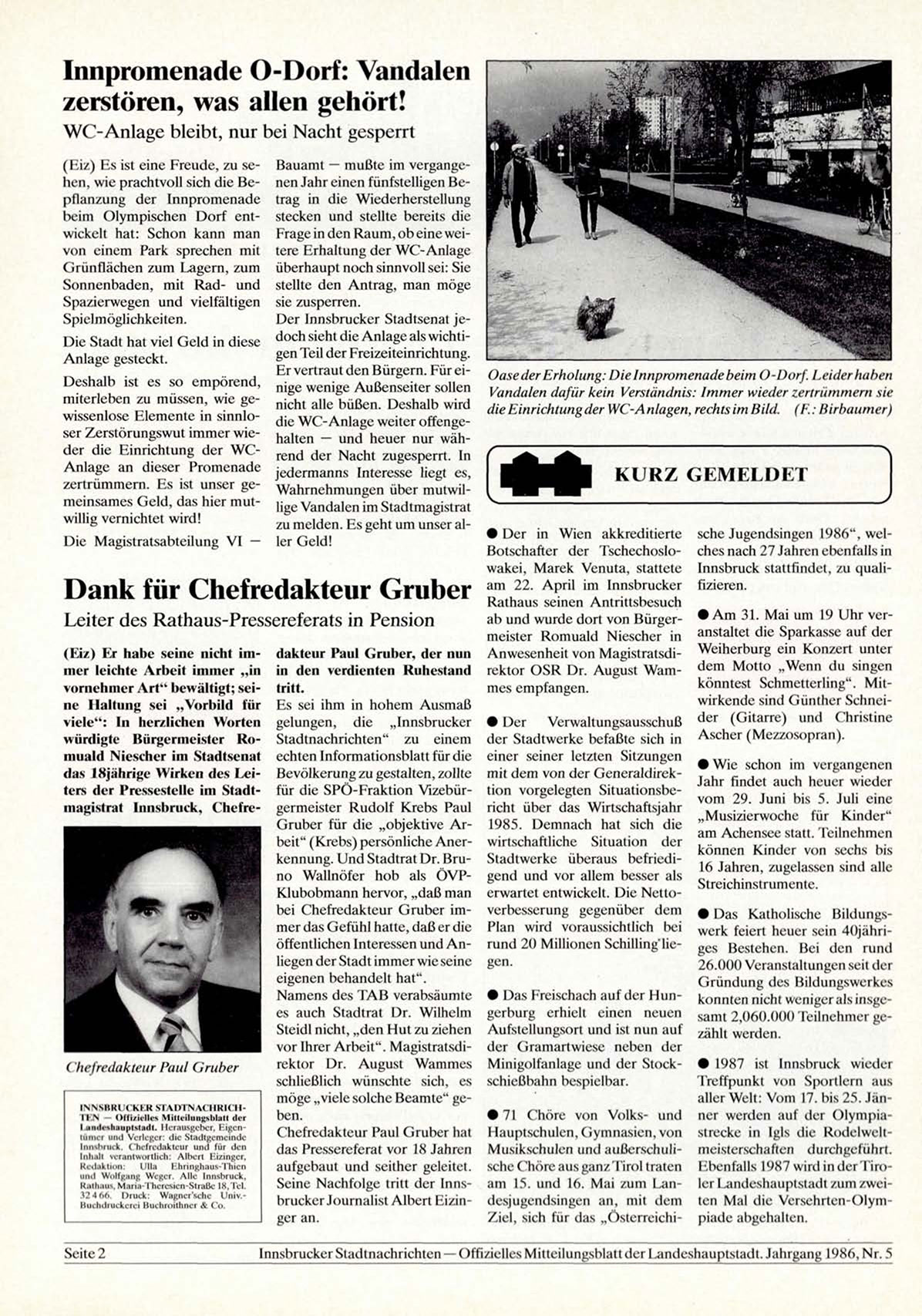 Innsbrucker Stadtnachrichten — Offizielles Mitteilungsblatt der Landeshauptstadt. Jahrgang 1986, Nr. 5