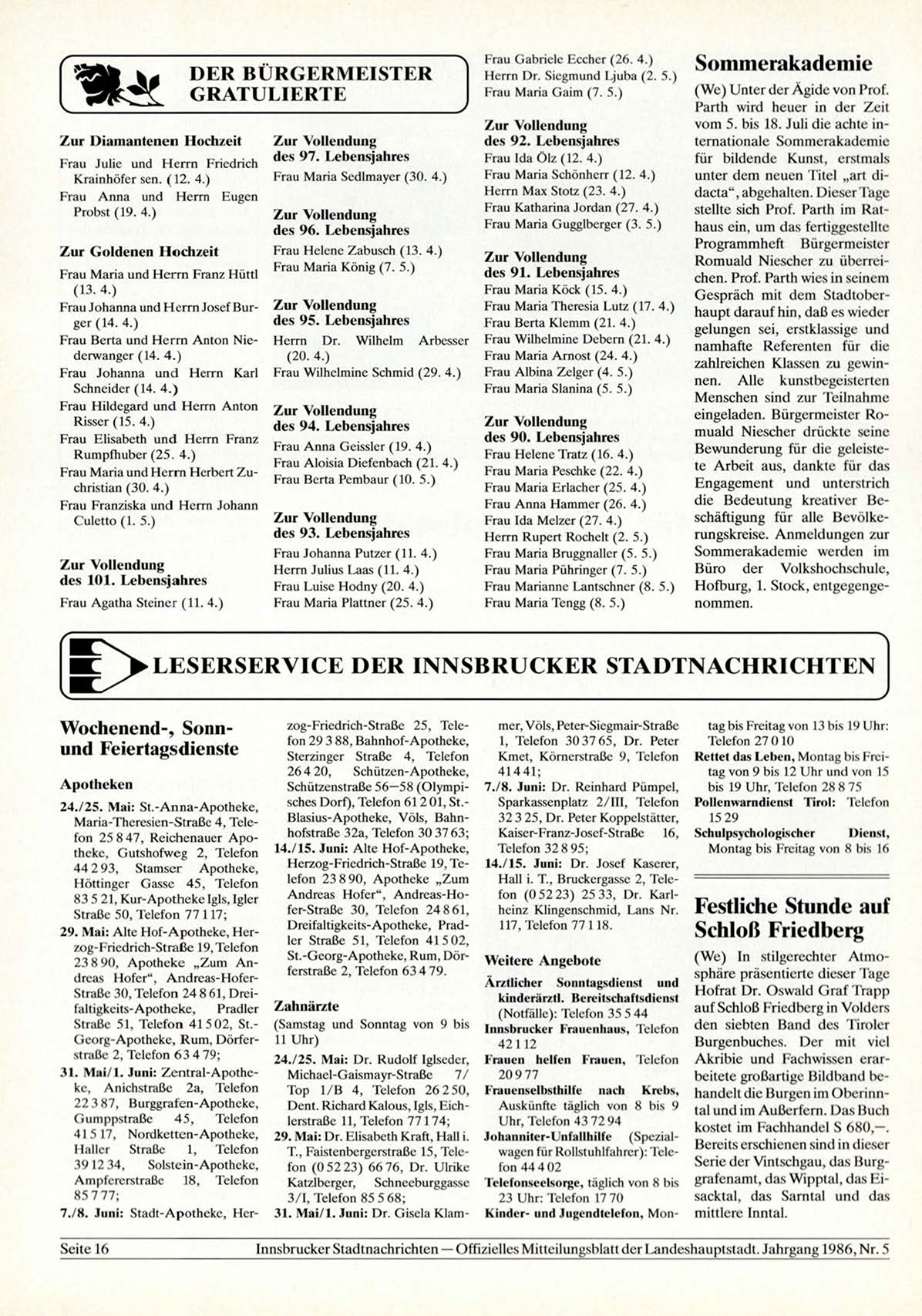 Innsbrucker Stadtnachrichten — Offizielles Mitteilungsblatt der Fandeshauptstadt. Jahrgang 1986, Nr. 5