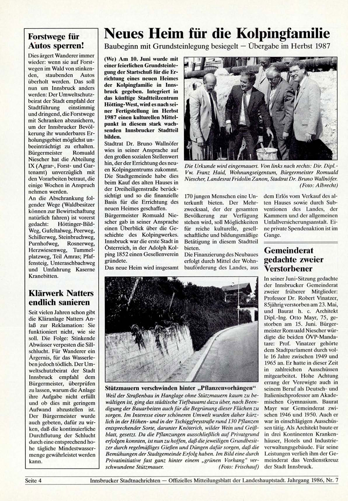 Innsbrucker Stadtnachrichten — Offizielles Mitteilungsblatt der Landeshauptstadt. Jahrgang 1986, Nr. 7