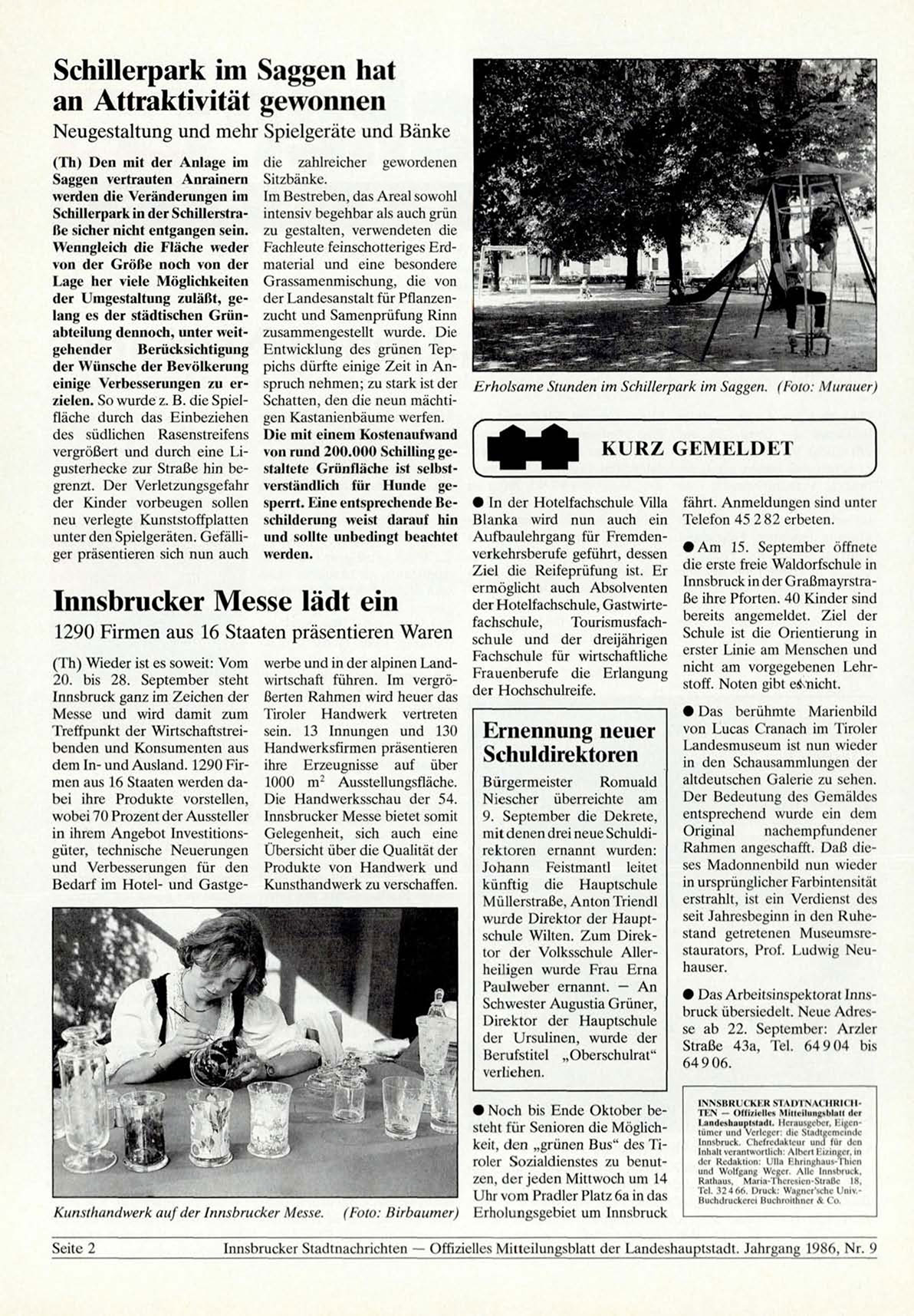 Innsbrucker Stadtnachrichten — Offizielles Mitteilungsblatt der Landeshauptstadt. Jahrgang 1986, Nr. 9