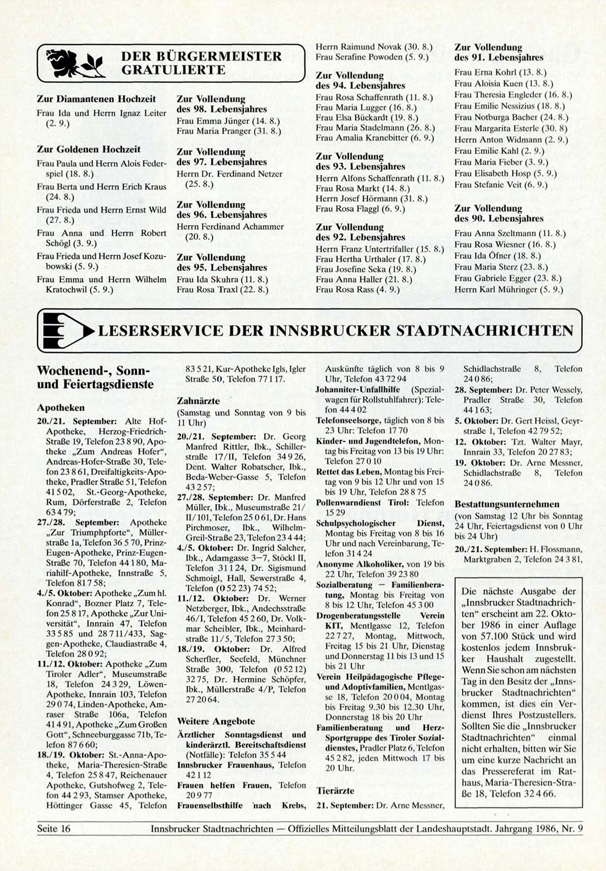 Innsbrucker Stadtnachrichten — Offizielles Mitteilungsblatt der Landeshauptstadt. Jahrgang 1986, Nr. 9