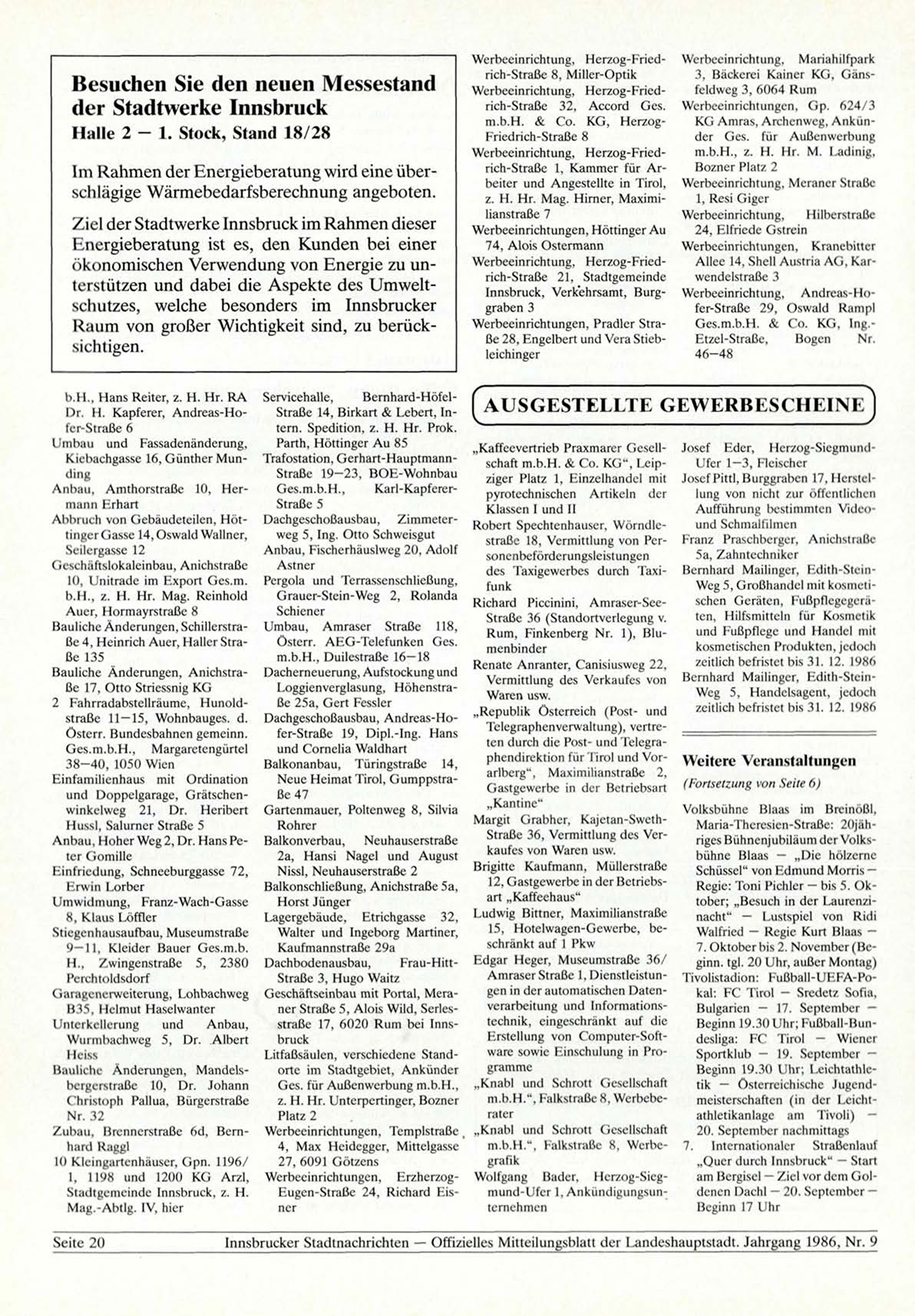 Innsbrucker Stadtnachrichten — Offizielles Mitteilungsblatt der Landeshauptstadt. Jahrgang 1986, Nr. 9