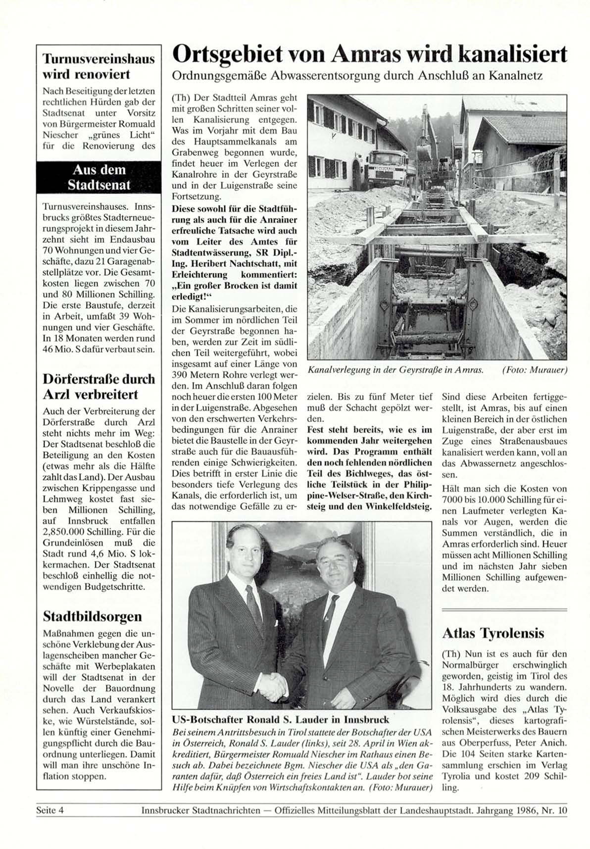 Innsbrucker Stadtnachrichten — Offizielles Mitteilungsblatt der Landeshauptstadt. Jahrgang 1986, Nr. 10