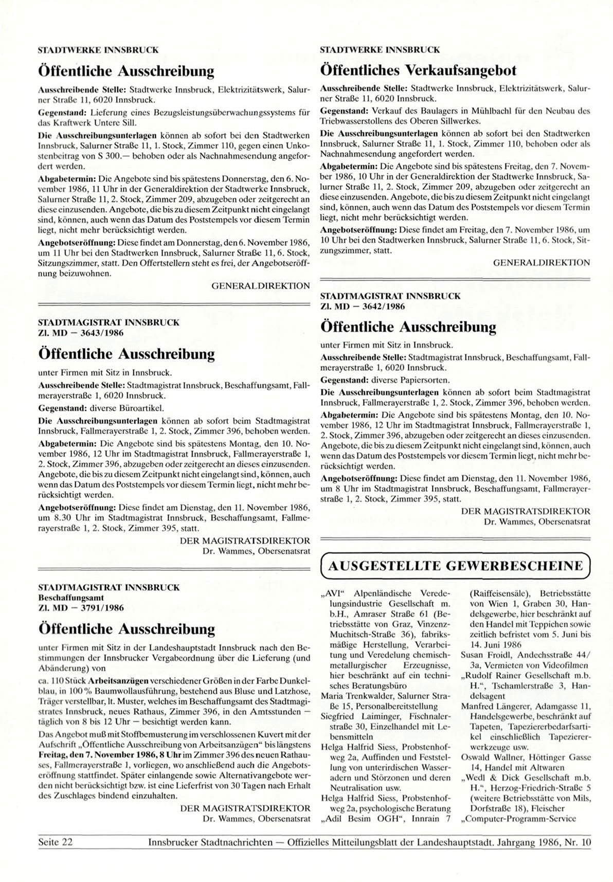 Abgabetermin: Die Angebote sind bis spätestens Montag, den 10. November 1986, 12 Uhr im Stadtmagistrat Innsbruck, Fallmeraycrstraße 1,
