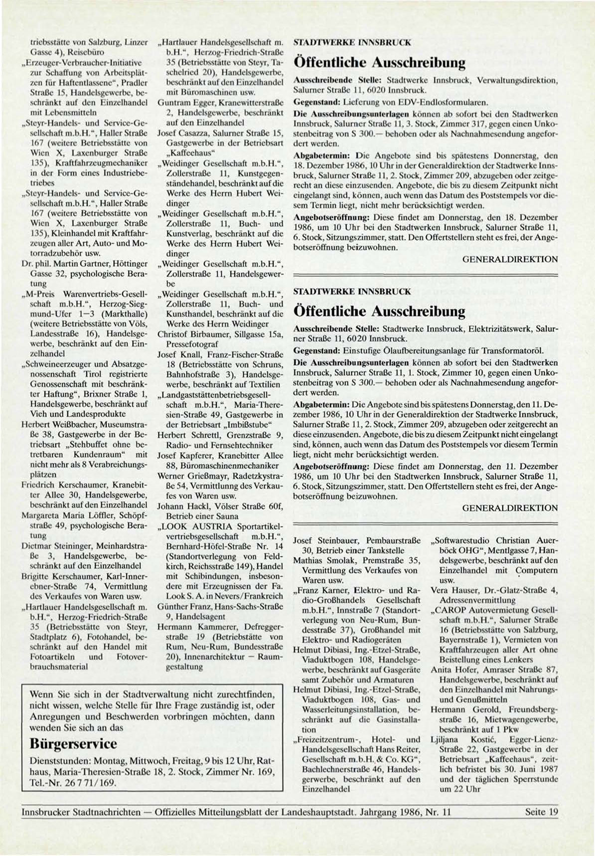 Zollcrstraße 11, Buch- und 1986, um 10 Uhr bei den Stadtwerken Innsbruck, Salurner Straße 11,
