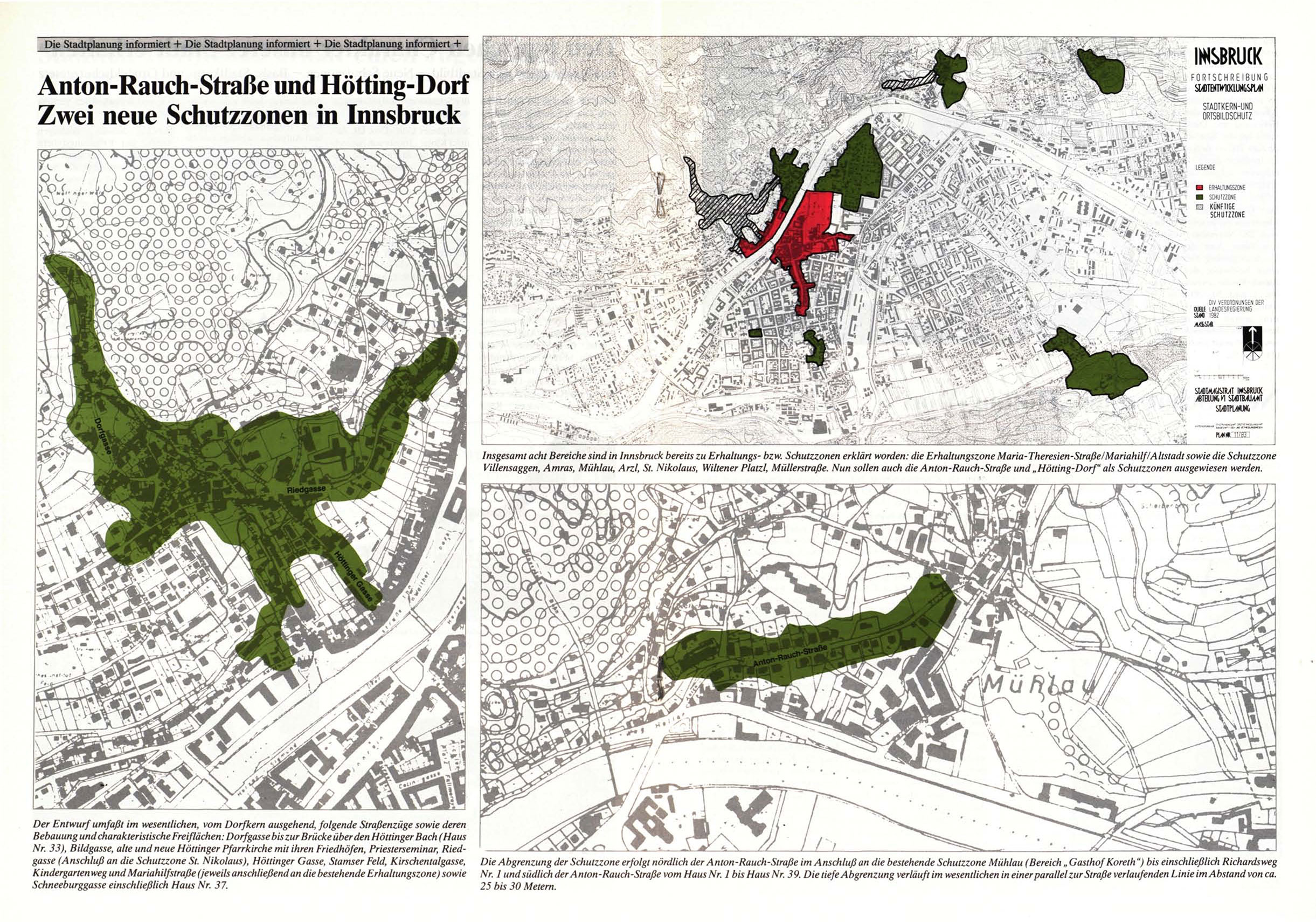 Villensaggen, Amras, Mühlau, Arzl, St. Nikolaus, Wiltener Platzl, Müllerstraße. Nun sollen auch die Anton-Rauch-Straße und „Hötting-Dorf als Schutzzonen ausgewiesen werden.