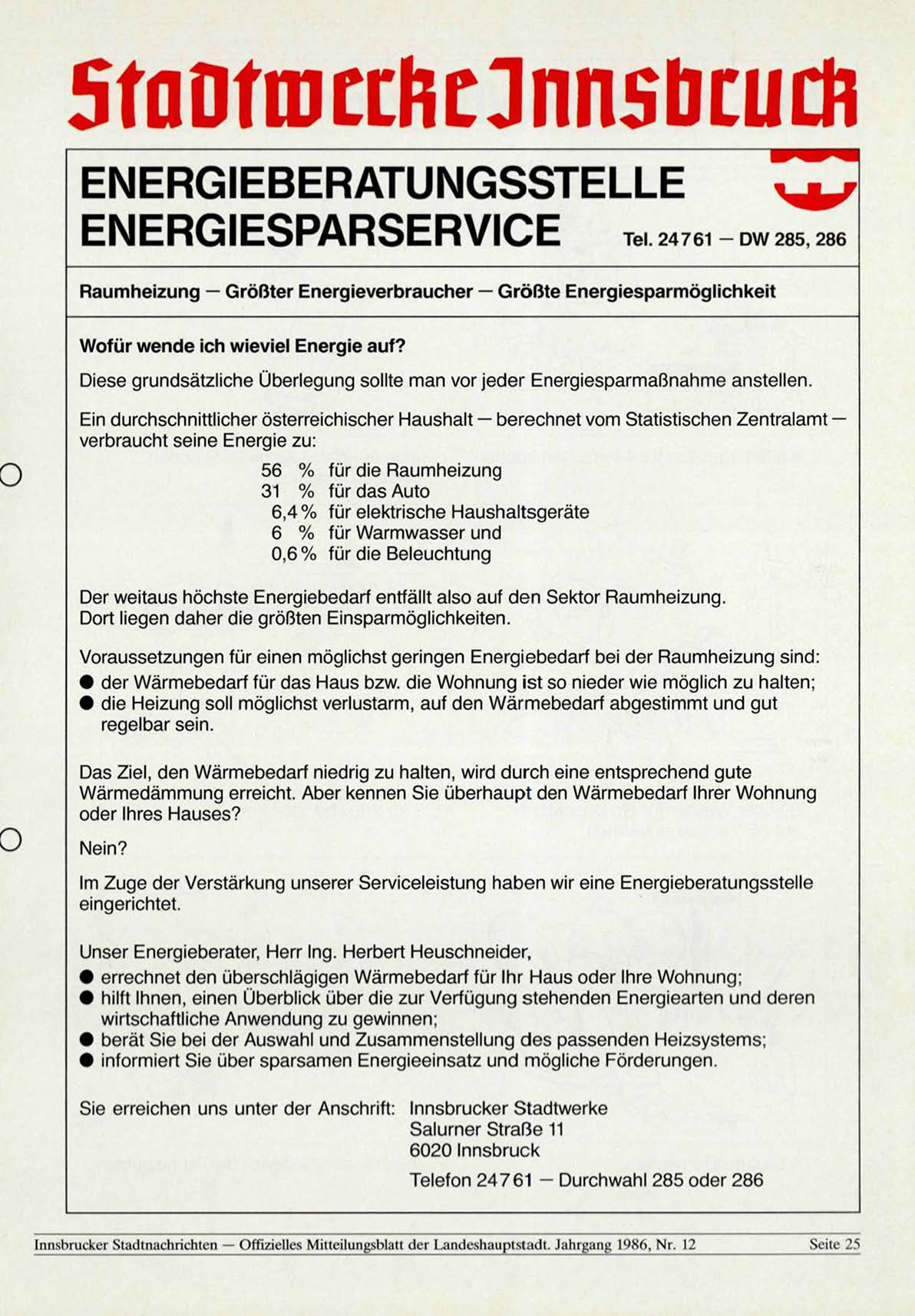 Innsbrucker Stadtnachrichten — Offizielles Mitteilungsblatt der Landeshauptstadt. Jahrgang 1986, Nr. 12