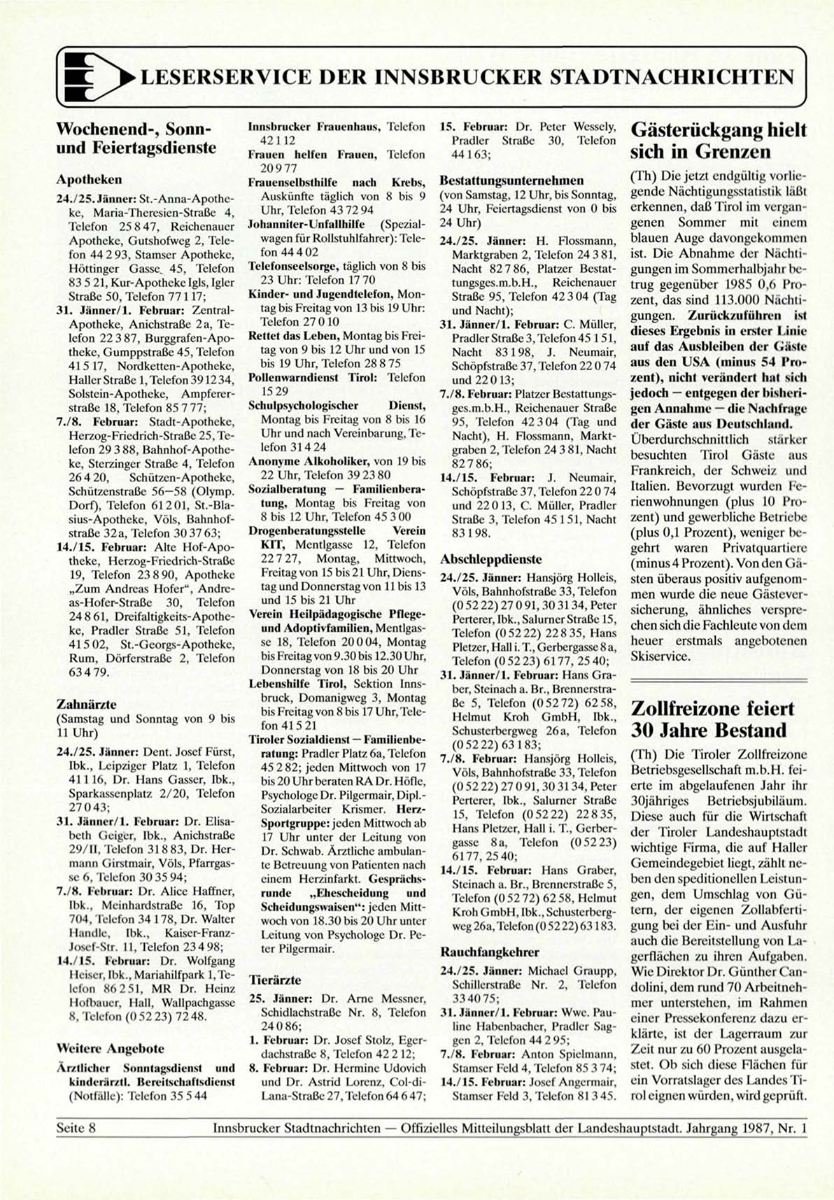 Innsbrucker Stadtnachrichten — Offizielles Mitteilungsblatt der Landeshauptstadt. Jahrgang 1987, Nr. 1