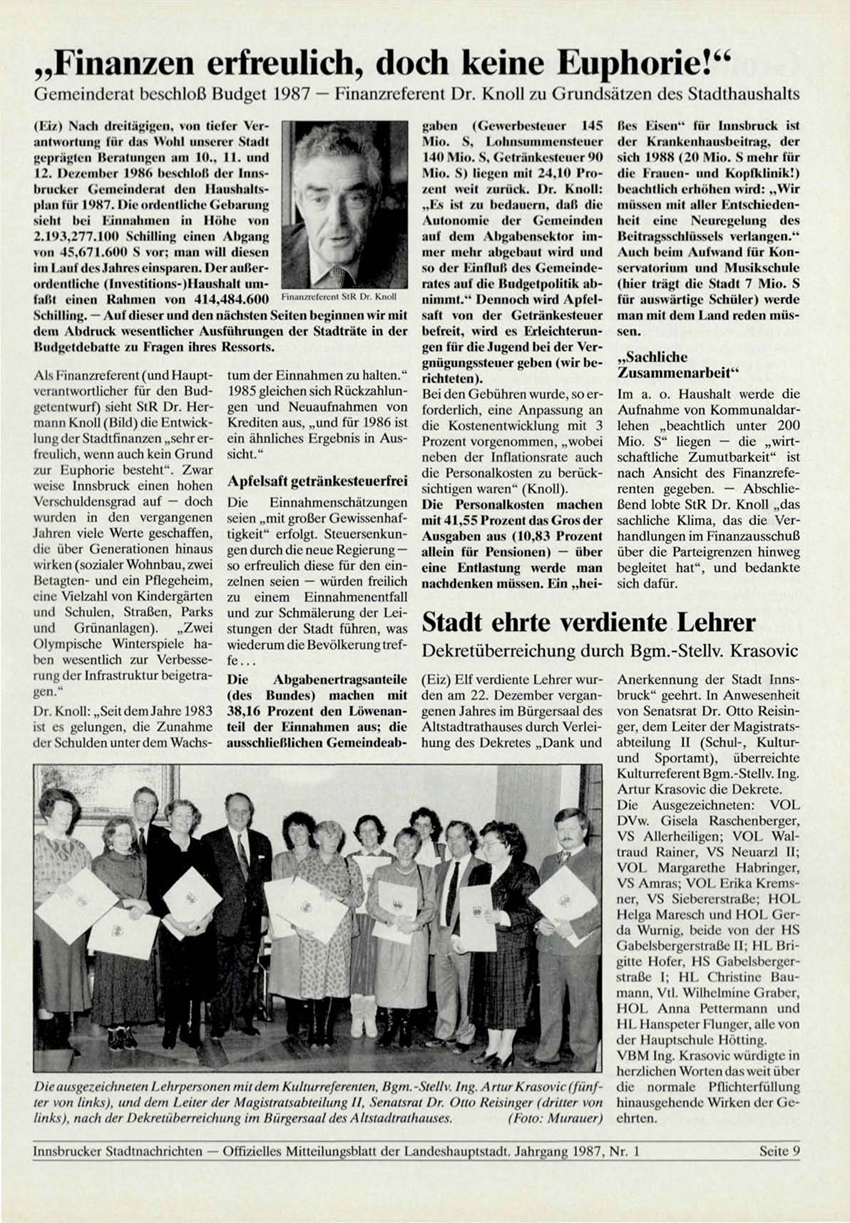 Innsbrucker Stadtnachrichten — Offizielles Mitteilungsblatt der Landeshauptstadt. Jahrgang 1987, Nr. 1