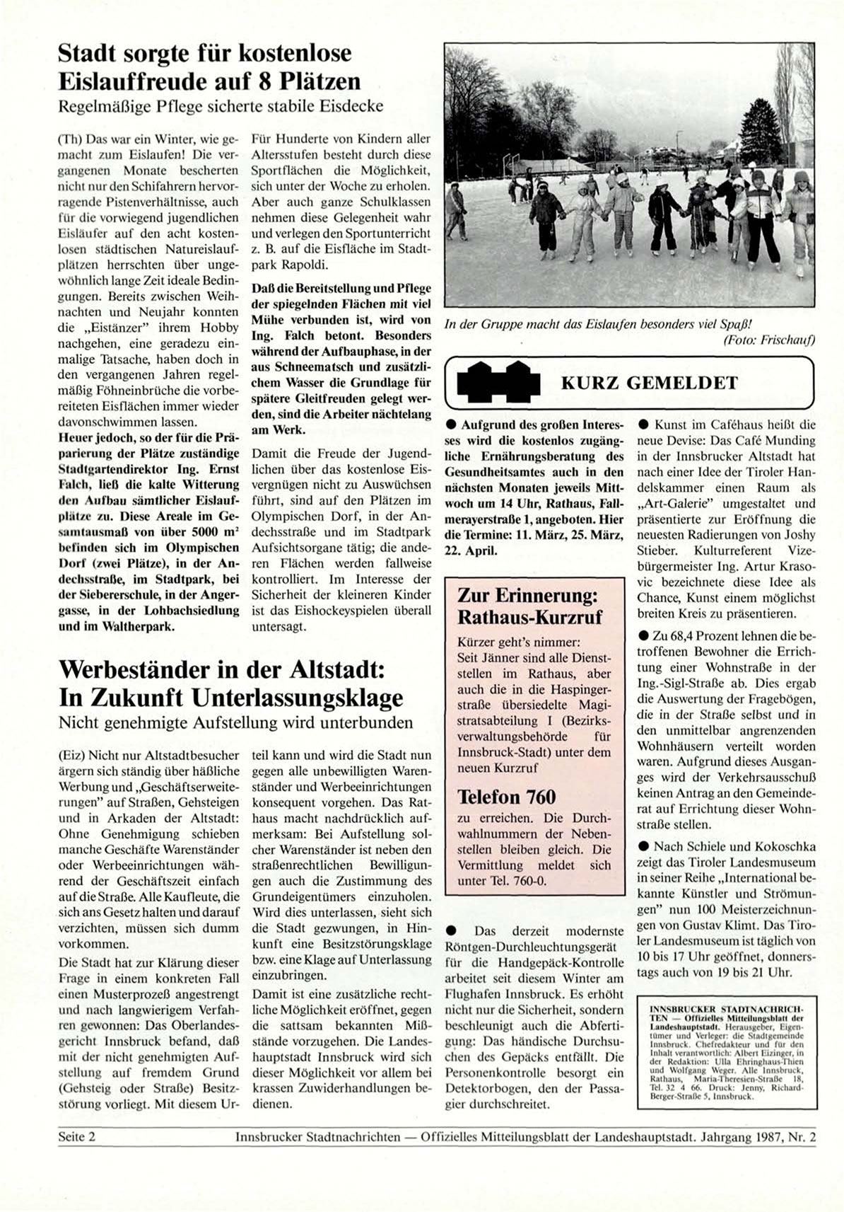 Innsbrucker Stadtnachrichten — Offizielles Mitteilungsblatt der Landeshauptstadt. Jahrgang 1987, Nr. 2