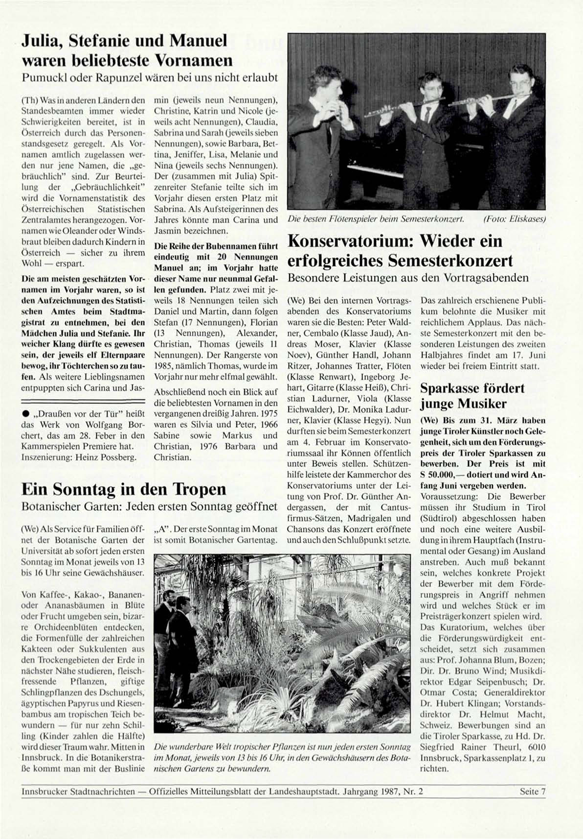 Innsbrucker Stadtnachrichten — Offizielles Mitteilungsblatt der Landeshauptstadt. Jahrgang 1987, Nr. 2