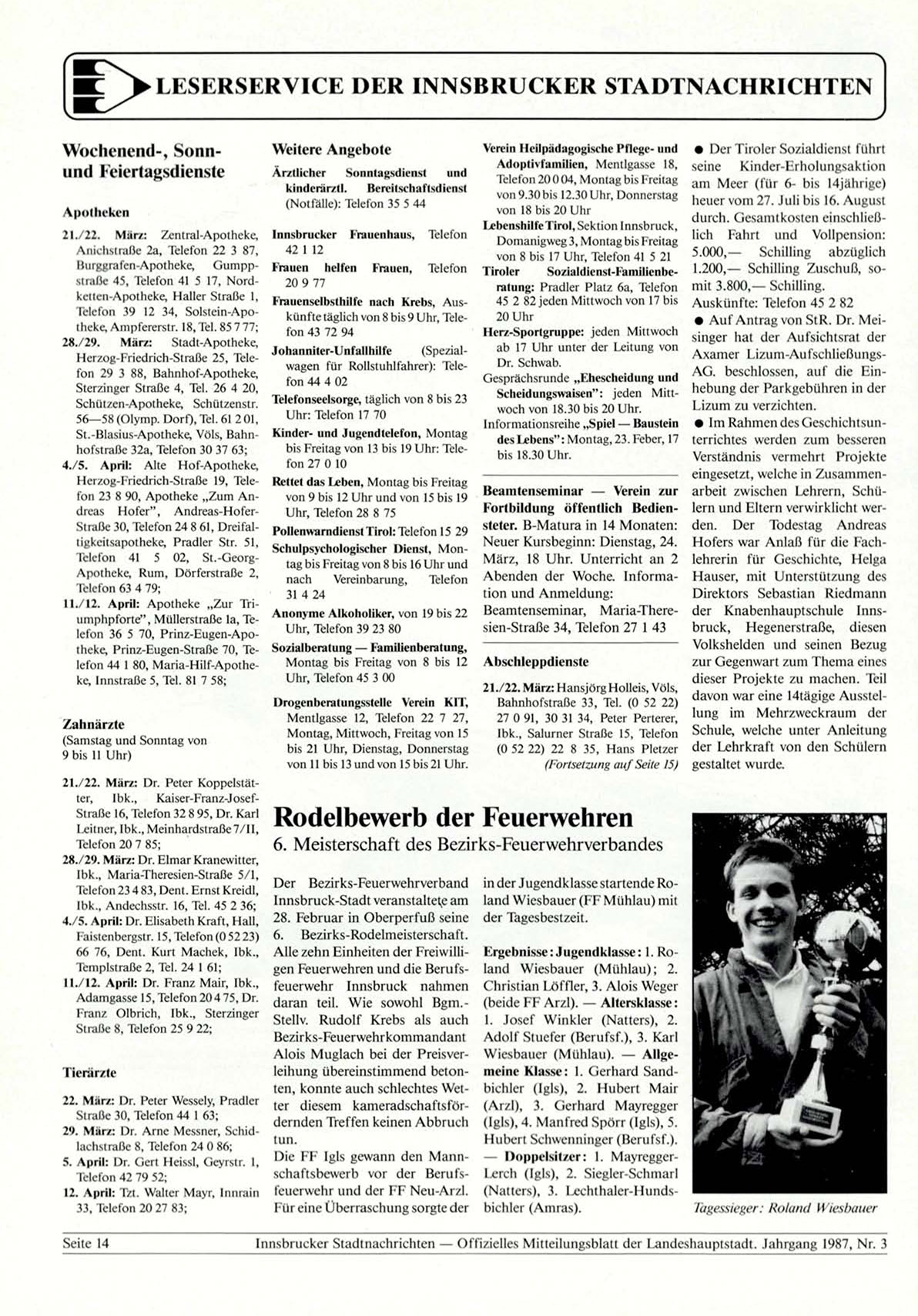 Innsbrucker Stadtnachrichten — Offizielles Mitteilungsblatt der Landeshauptstadt. Jahrgang 1987, Nr. 3