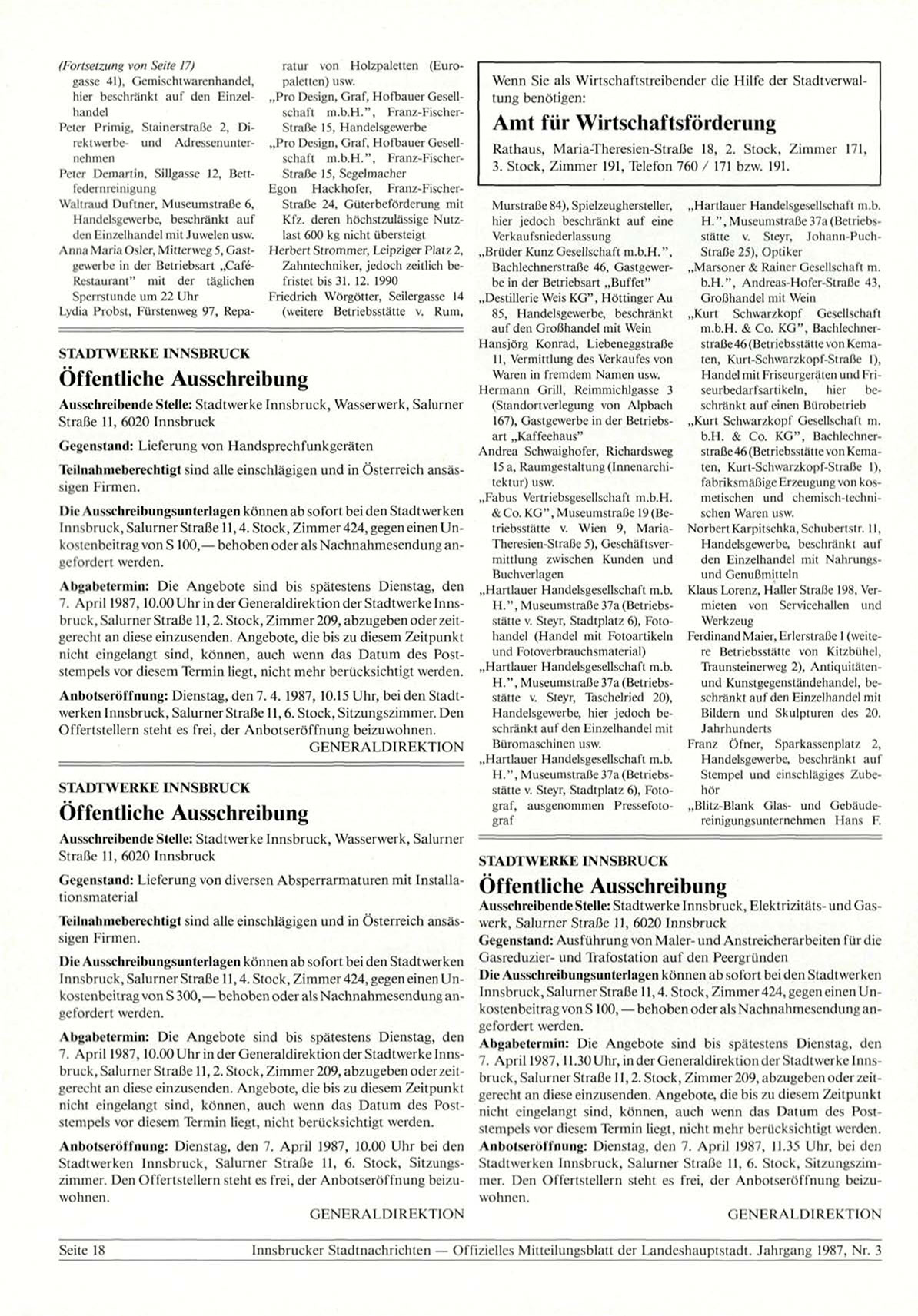 Innsbrucker Stadtnachrichten — Offizielles Mitteilungsblatt der Landeshauptstadt. Jahrgang 1987, Nr. 3
