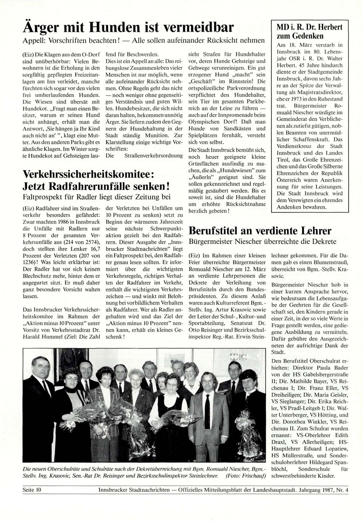 Innsbrucker Stadtnachrichten — Offizielles Mitteilungsblatt der Landeshauptstadt. Jahrgang 1987, Nr. 4