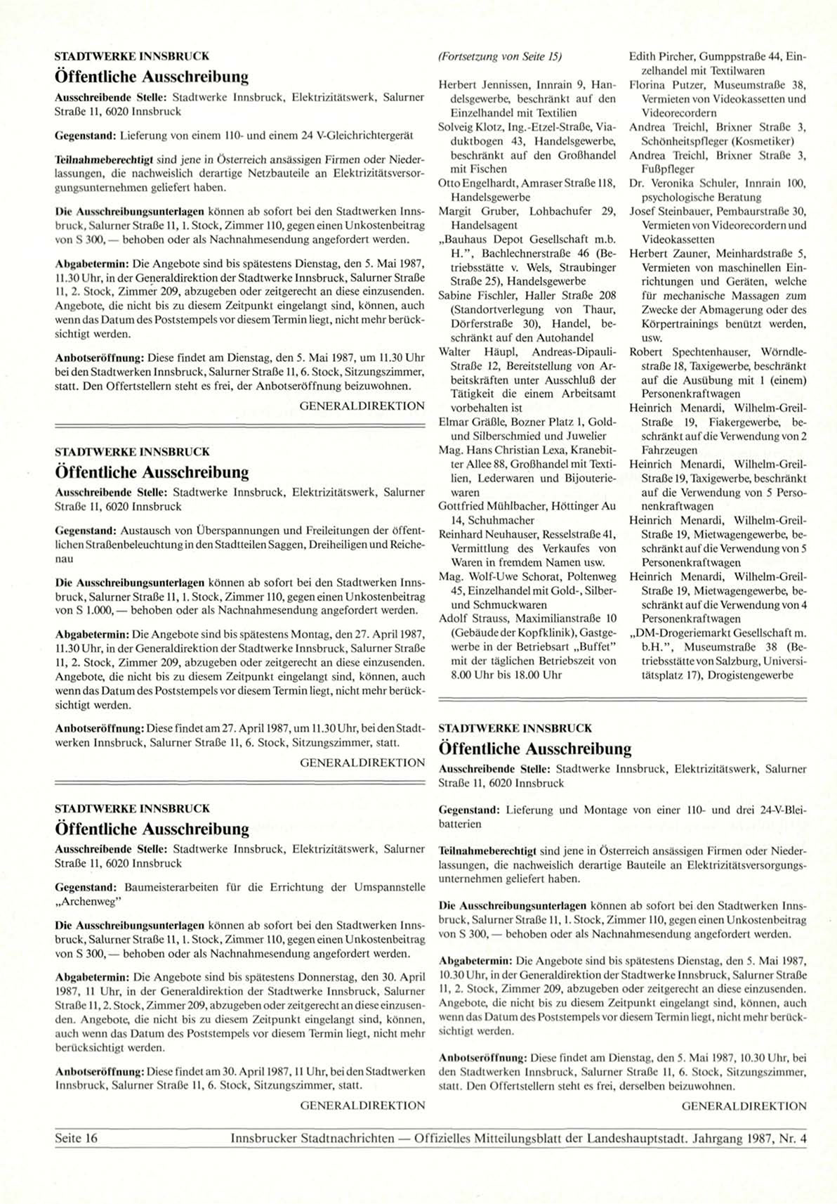 Innsbrucker Stadtnachrichten — Offizielles Mitteilungsblatt der Landeshauptstadt. Jahrgang 1987, Nr. 4