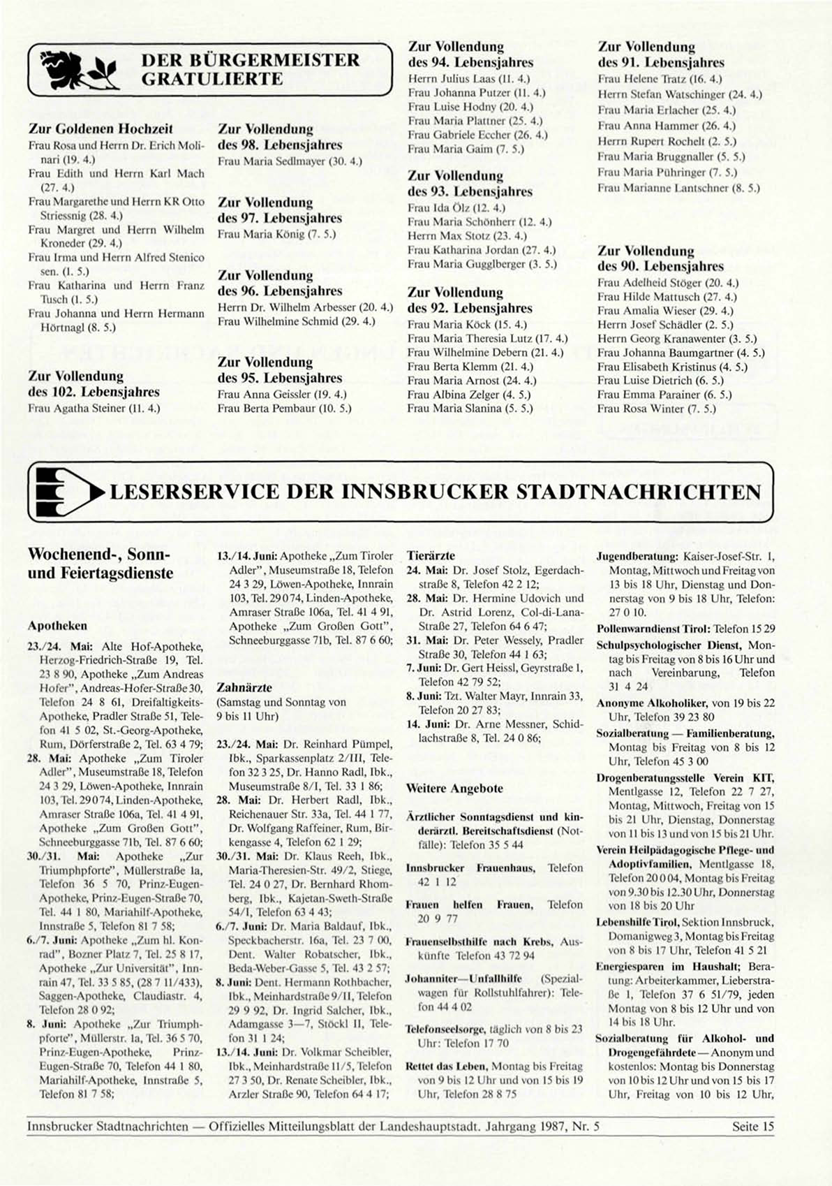 Innsbrucker Stadtnachrichten — Offizielles Mitteilungsblatt der Landeshauptstadt. Jahrgang 1987, Nr. 5