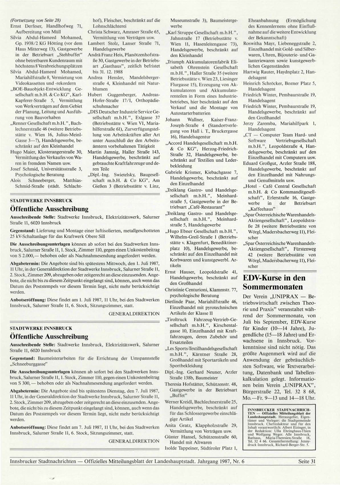 Innsbrucker Stadtnachrichten — Offizielles Mitteilungsblatt der Landeshauptstadt. Jahrgang 1987, Nr. 6