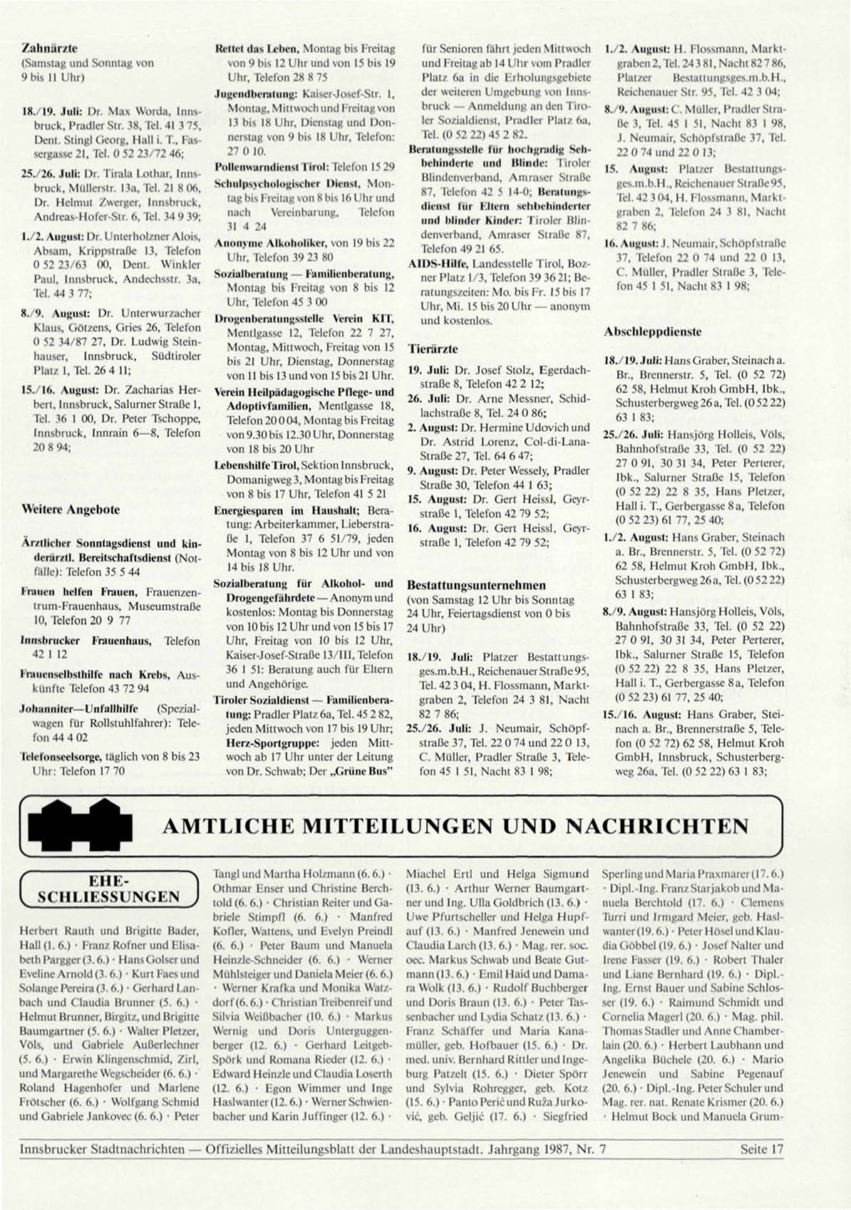 Innsbrucker Stadtnachrichten — Offizielles Mitteilungsblatt der Landeshauptstadt. Jahrgang 1987, Nr. 7