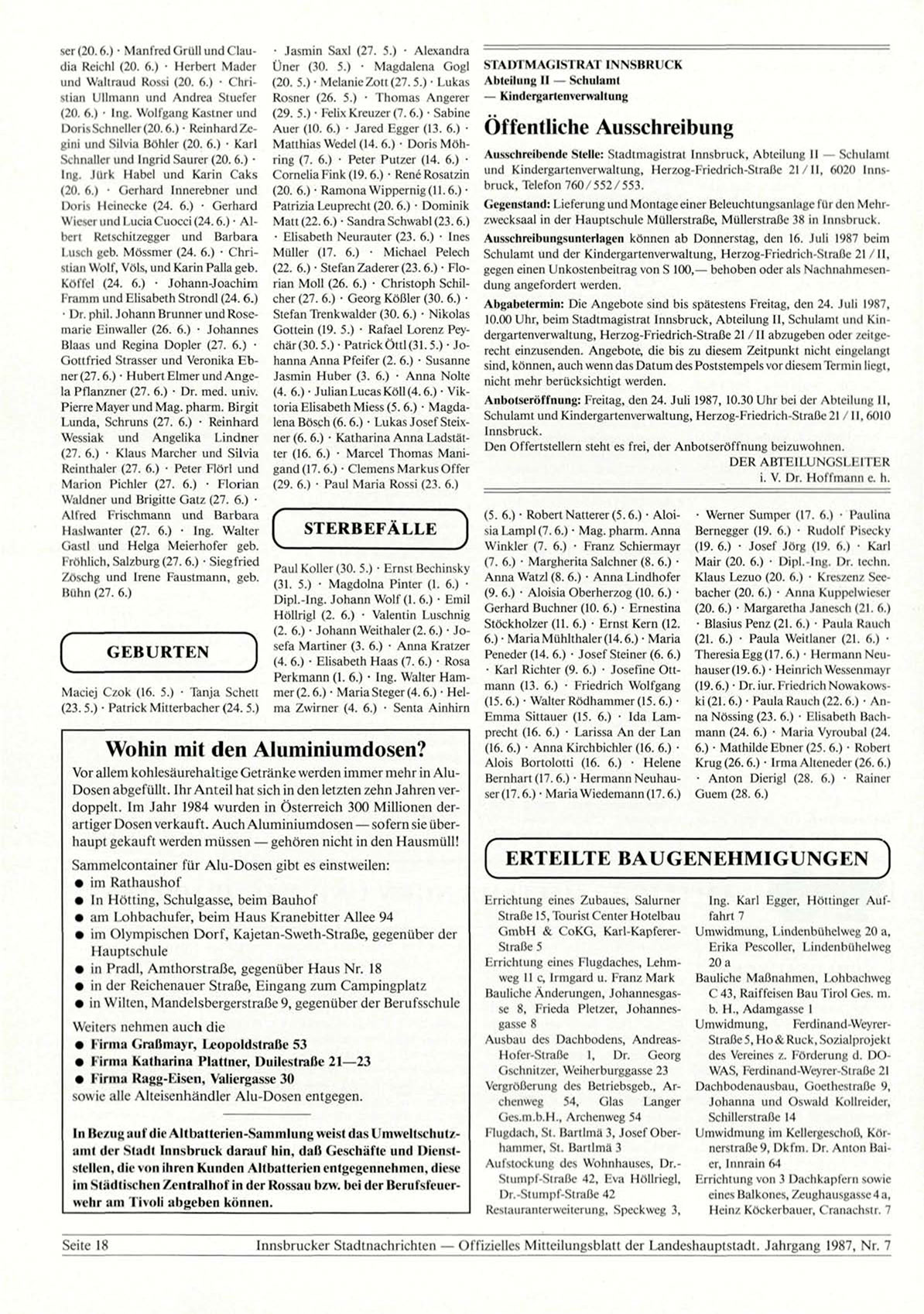 Innsbrucker Stadtnachrichten — Offizielles Mitteilungsblatt der Landeshauptstadt. Jahrgang 1987, Nr. 7