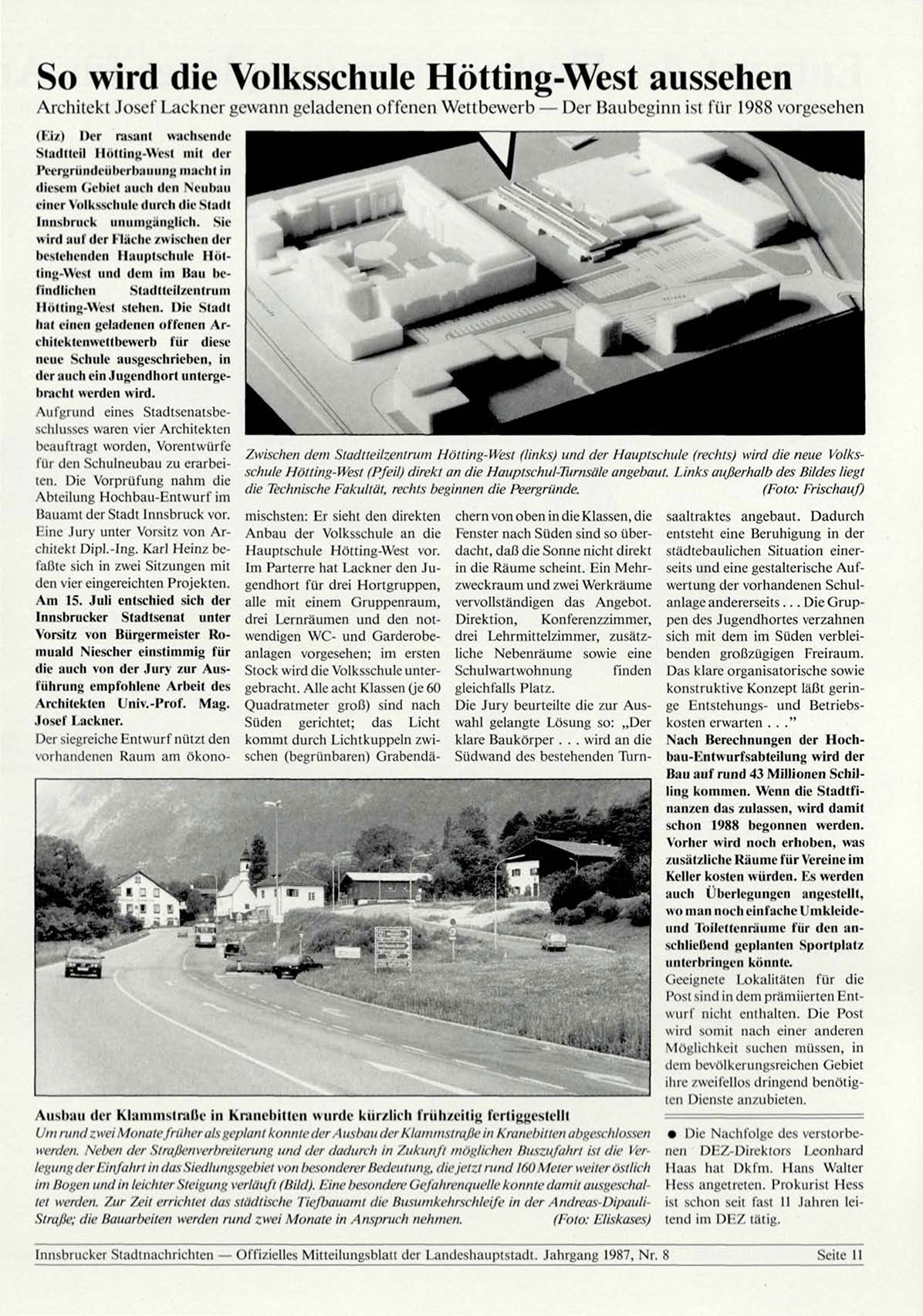 y.wischen dem Stadtteilzentrum Hötting-West (links) und der Huuptscliule (reclüs) wird die neue Volksschule Hötting-West (Pfeil) direkt an die Hauptschul-Turnsäle angebaut. Links außerhalb des Bildes liegt