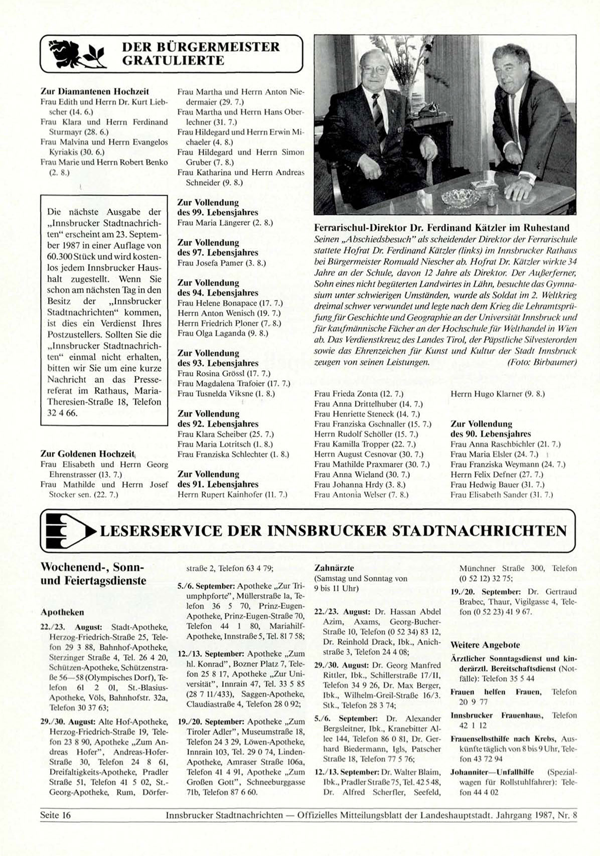 Innsbrucker Stadtnachrichten — Offizielles Mitteilungsblatt der Landeshauptstadt. Jahrgang 1987, Nr. 8