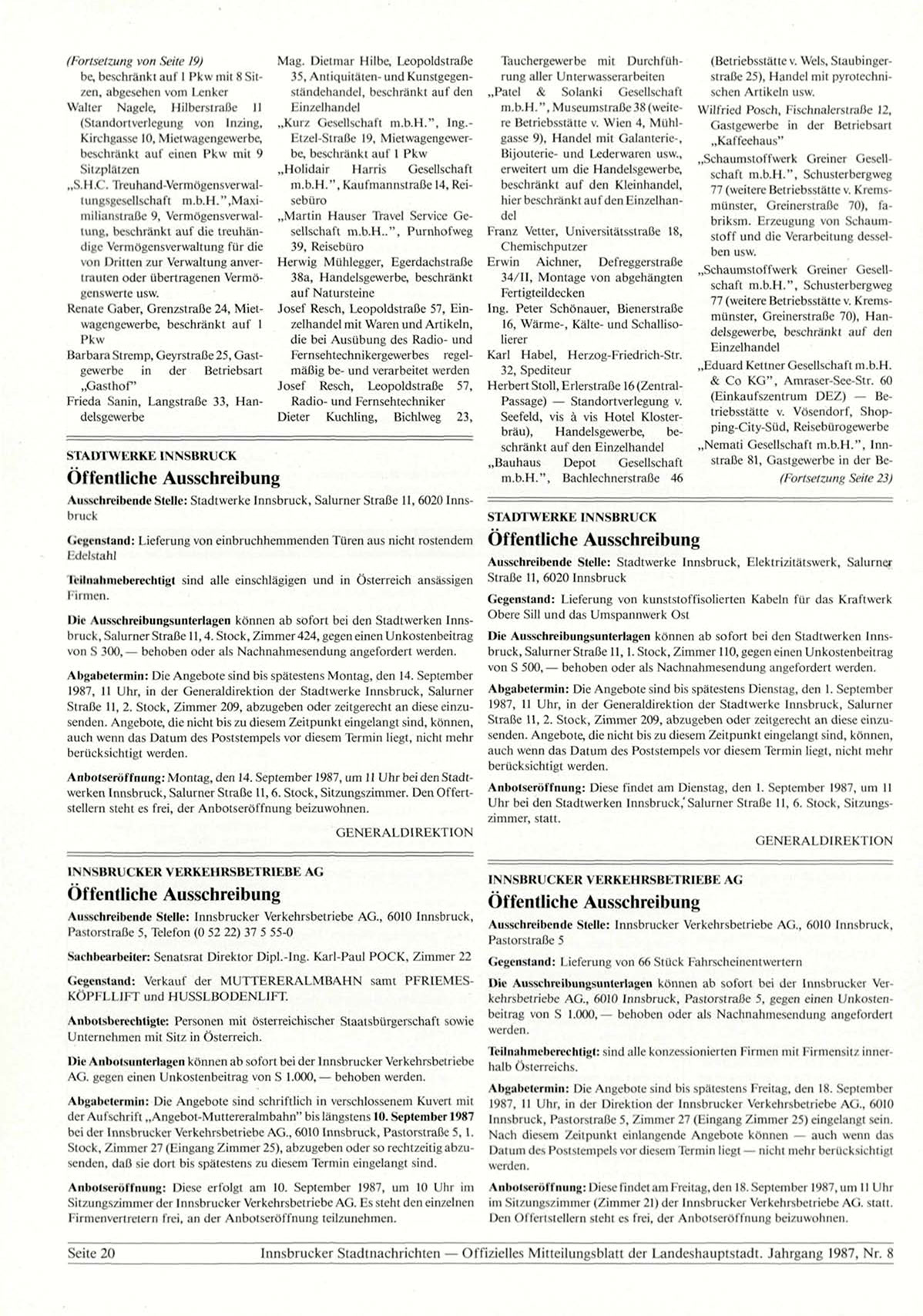 Anbotseröffnung: Montag, den 14. September 1987, um 11 Uhr bei den Stadtwerken Innsbruck, Salurner Straße 11, 6. Stock, Sitzungszimmer. Den Offert- Anbotseröffnung: Diese findet am Dienstag, den 1. September 1987, um 11