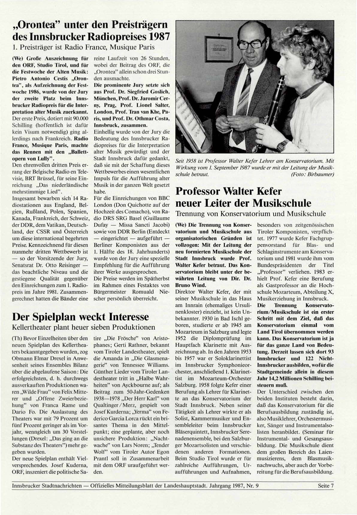 Walter Kefer betraut. Das Konservatorium bleibt unter der bewährten Leitung von Dir. Dr.