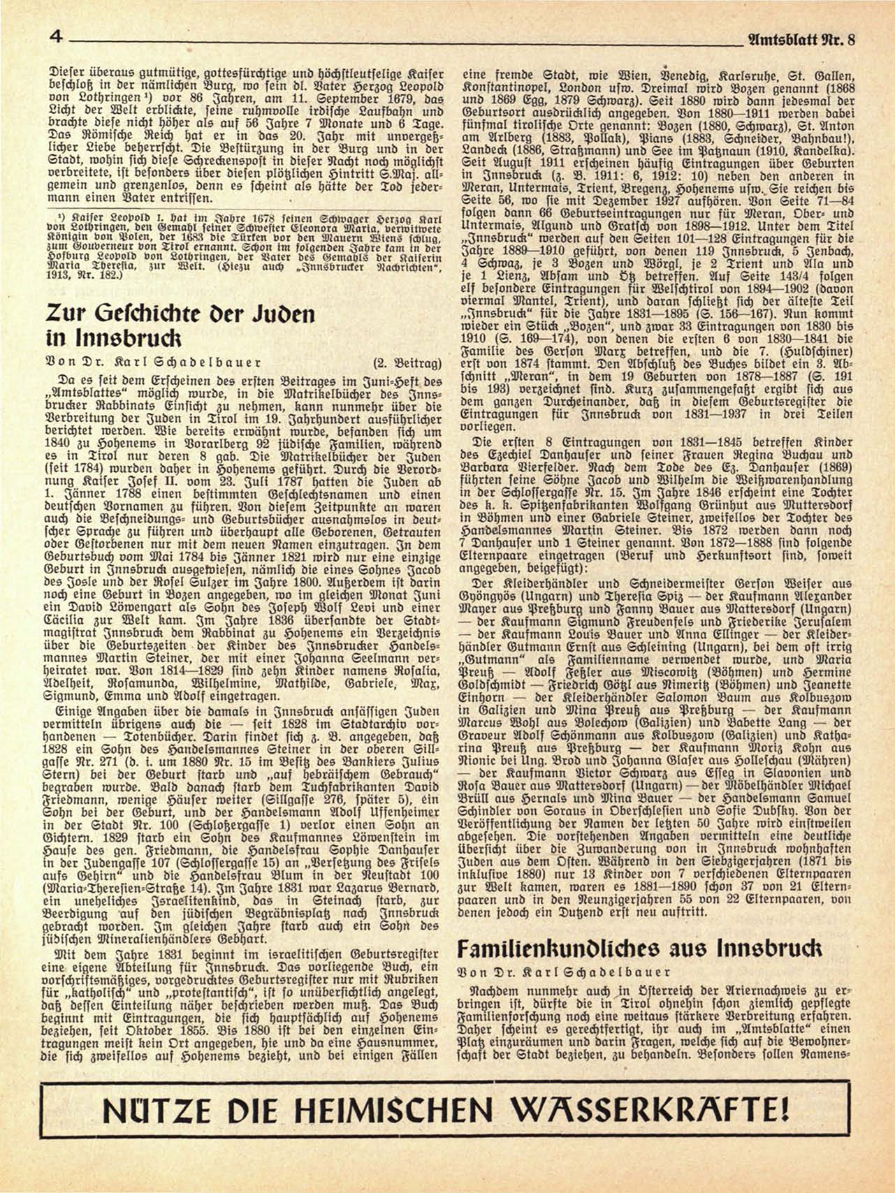 „Amtsblattes" möglich wurde, in die Matrikelbücher des Innsbrucker Rabbinats Einficht Zu nehmen, kann nunmehr über die