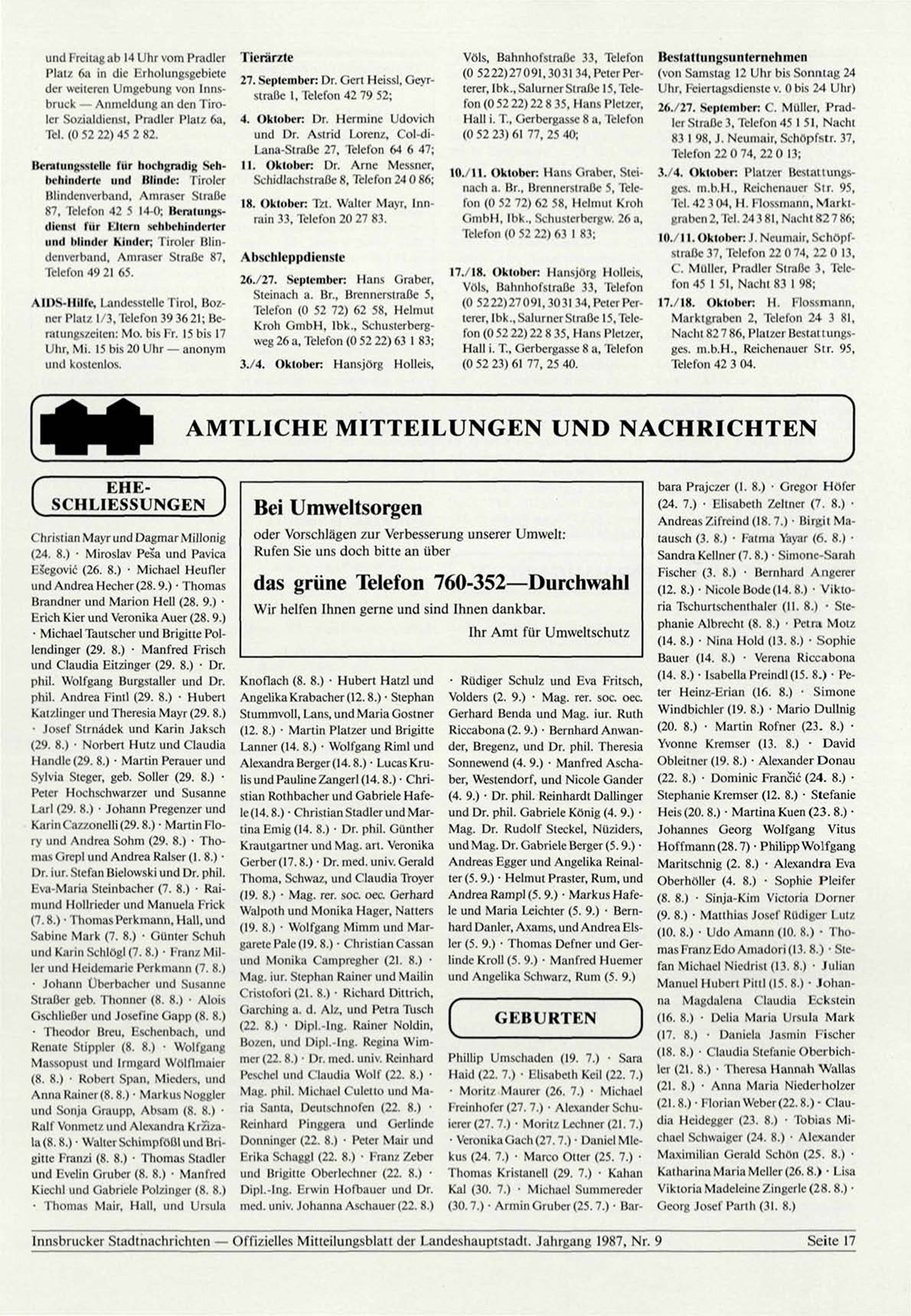 Innsbrucker Stadtnachrichten — Offizielles Mitteilungsblatt der Landeshauptstadt. Jahrgang 1987, Nr. 9