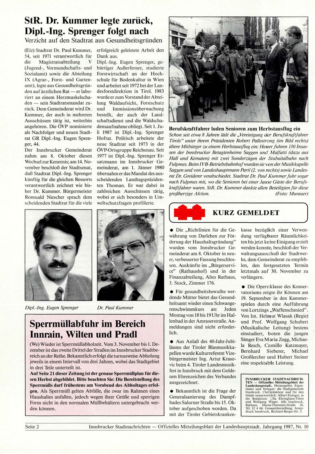 Innsbrucker Stadtnachrichten — Offizielles Mitteilungsblatt der Landeshauptstadt. Jahrgang 1987, Nr. 10