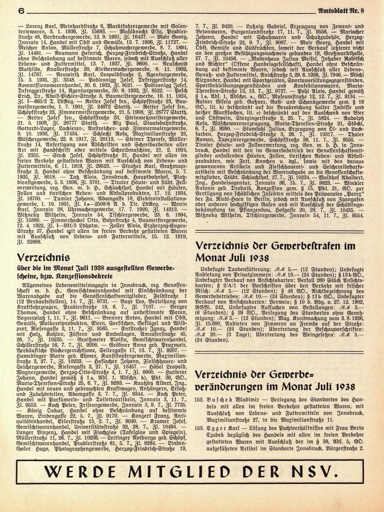 über die im Monat Juli 1938 ausgestellten Gewerbescheine, bzw. Konzesfionsoekrete