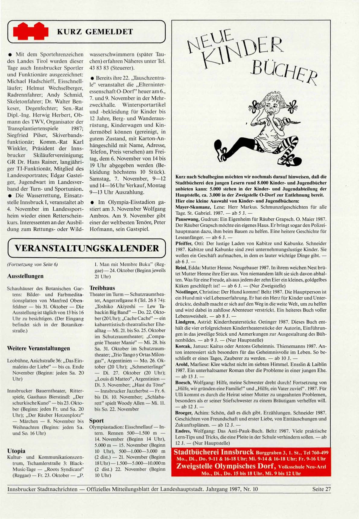 Innsbrucker Stadtnachrichten — Offizielles Mitteilungsblatt der Landeshauptstadt. Jahrgang 1987, Nr. 10