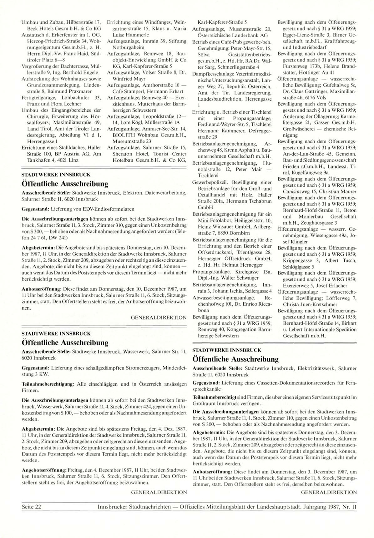 Innsbrucker Stadtnachrichten — Offizielles Mitteilungsblatt der Landeshauptstadt. Jahrgang 1987, Nr. 11