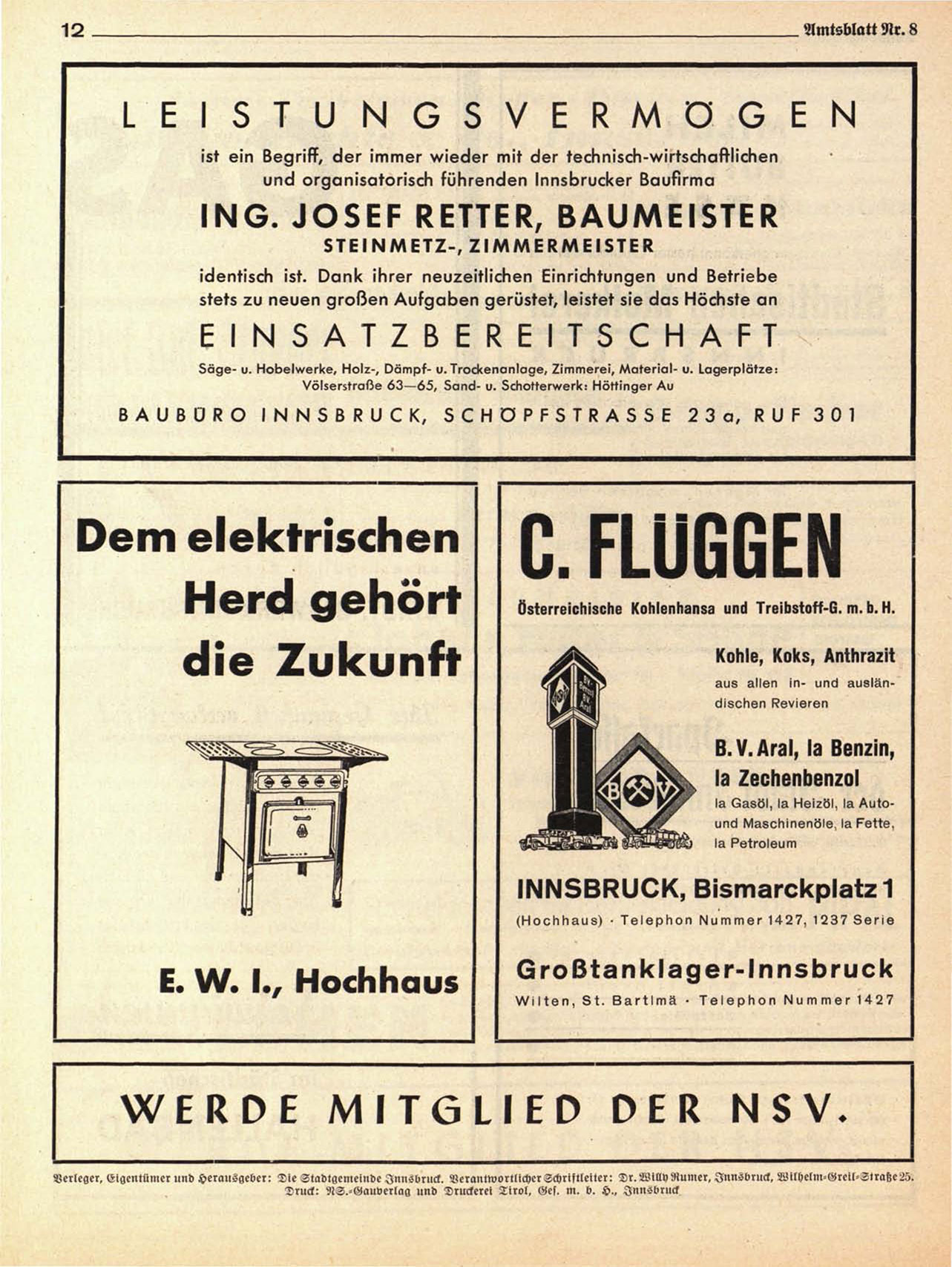 Verleger. Eigentümer und Herausgeber: Die Stadtgemeinde Innsbruck. Verantwortlicher Schriftleiter: Dr. Willy Rumer, Innsbruck, Wilhelm-Greil-Straße25.