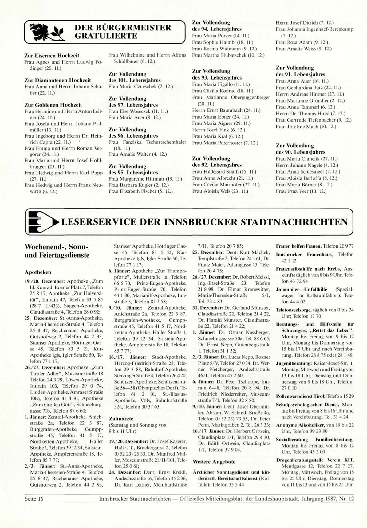 Innsbrucker Stadtnachrichten — Offizielles Mitteilungsblatt der Landeshauptstadt. Jahrgang 1987, Nr. 12