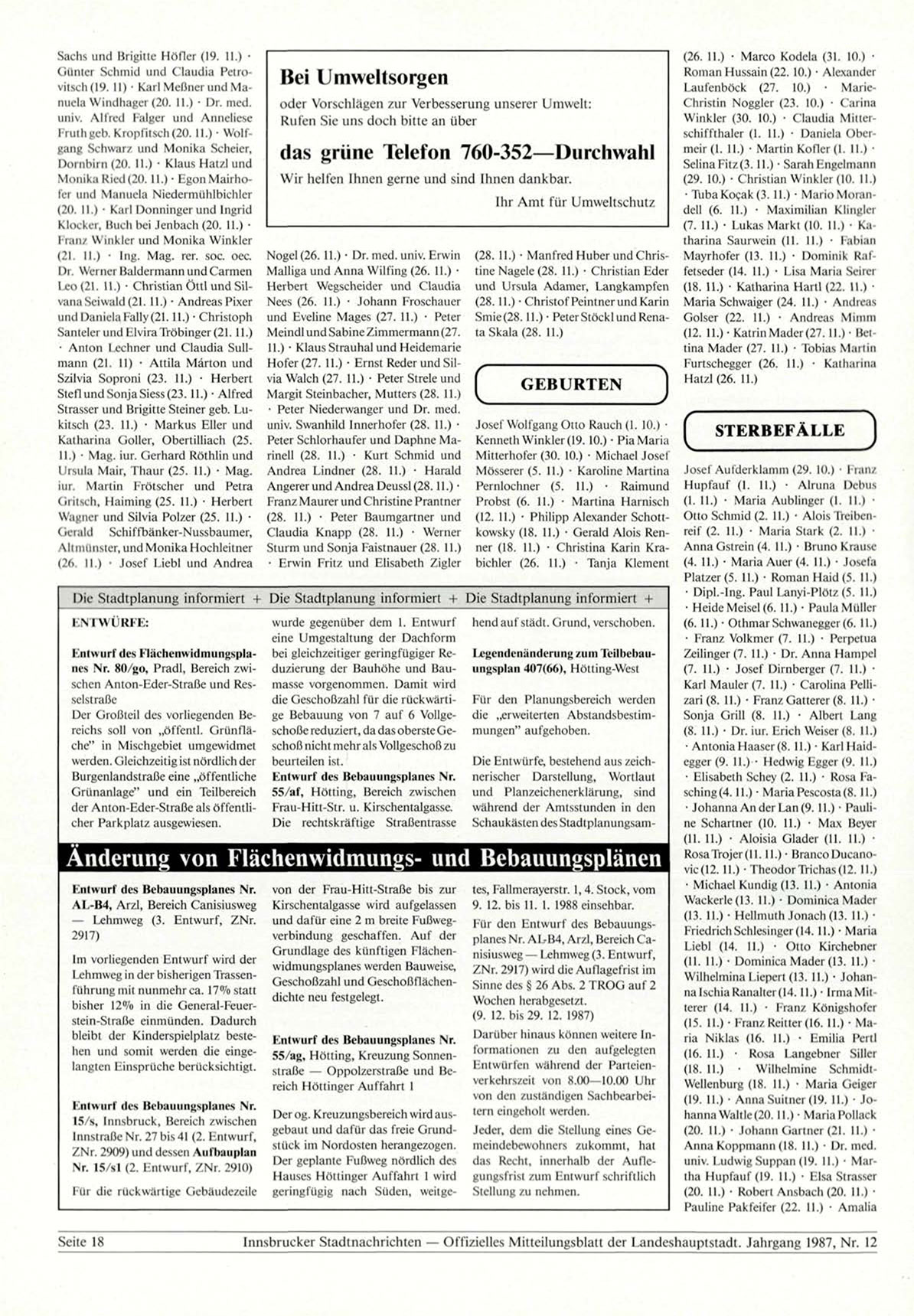 Innsbrucker Stadtnachrichten — Offizielles Mitteilungsblatt der Landeshauptstadt. Jahrgang 1987, Nr. 12