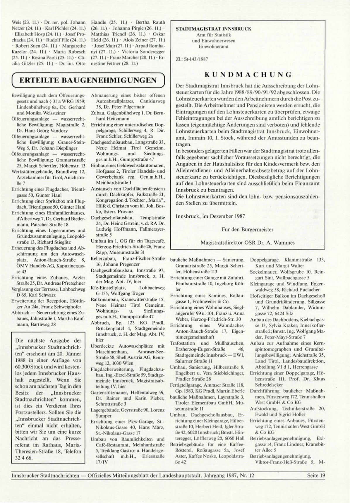Innsbi ucker Stadtnachrichten — Offizielles Mitteilungsblatt der Landeshauptstadt. Jahrgang 1987, Nr. 12