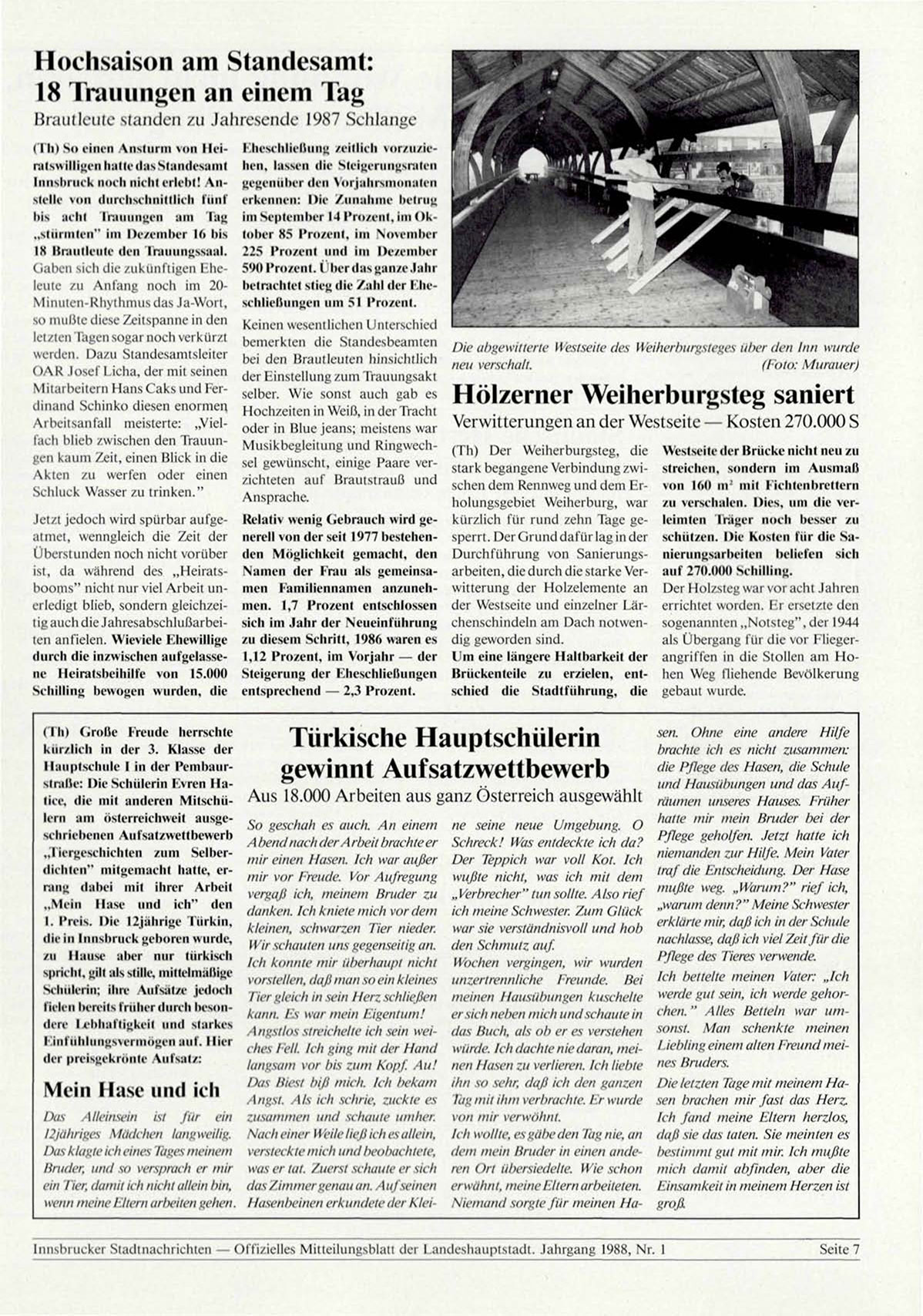 Innsbrucker Stadtnachrichten — Offizielles Mitteilungsblatt der Landeshauptstadt. Jahrgang 1988, Nr.