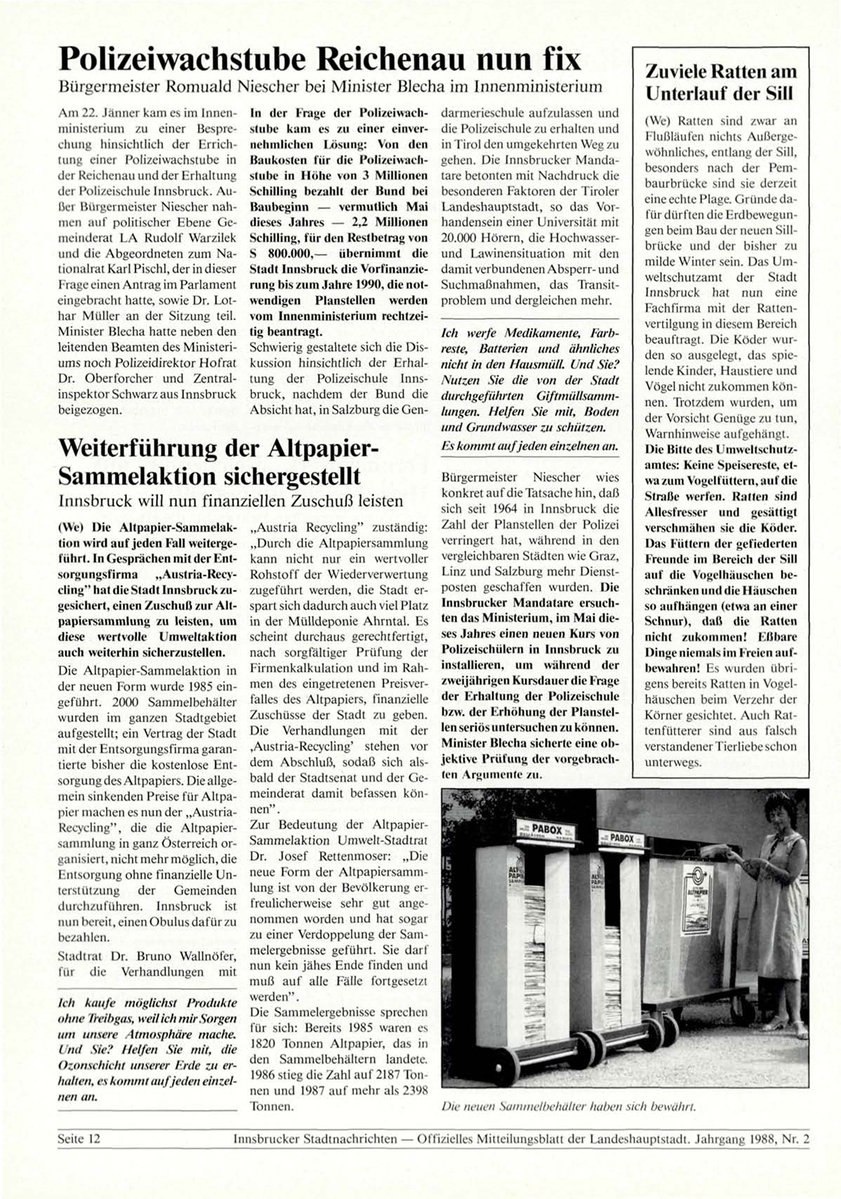 (We) Die Altpapier-Sammelaktion wird auf jeden Fall weitergefiihrl. In Gesprächen mit der Kntsorgu ngsf irma „Austria-Recycling"1 hat die Stadt Innsbruck zugesichert, einen Zuschuß zur Altpapiersammlung zu leisten, um
