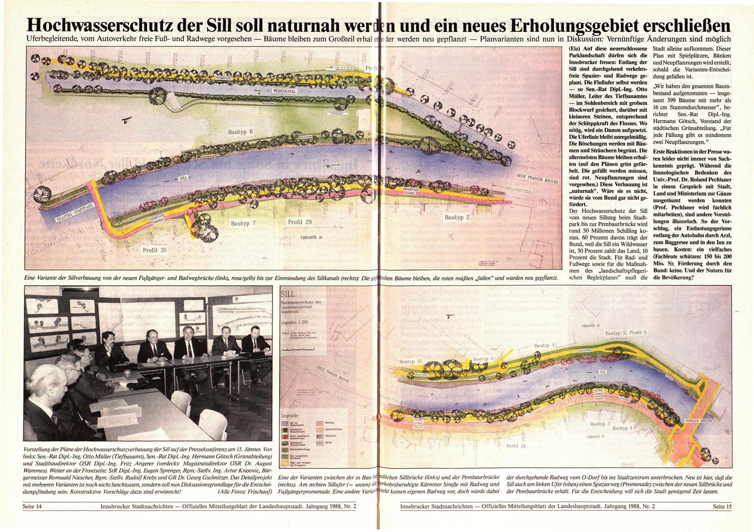 Wammes). Weiter an der Frontseite: StR Dipi-Ing. Eugen Sprenger, Bgm.-Stellv. Ing. Artur Krasovic, Bürgermeister Romuald Niescher, Bgm.-Stellv. Rudolf Krebs und GR Dr. Georg Gschnitzer. Das Detailprojekt Eine der Varianten zwischen der in Bau tä Glichen Sillbrücke (links) und der Pembaurbrücke der durchgehende Radweg vom O-Dorfbis ins Stadtzentrum unterbrochen. Neu ist hier, daß die