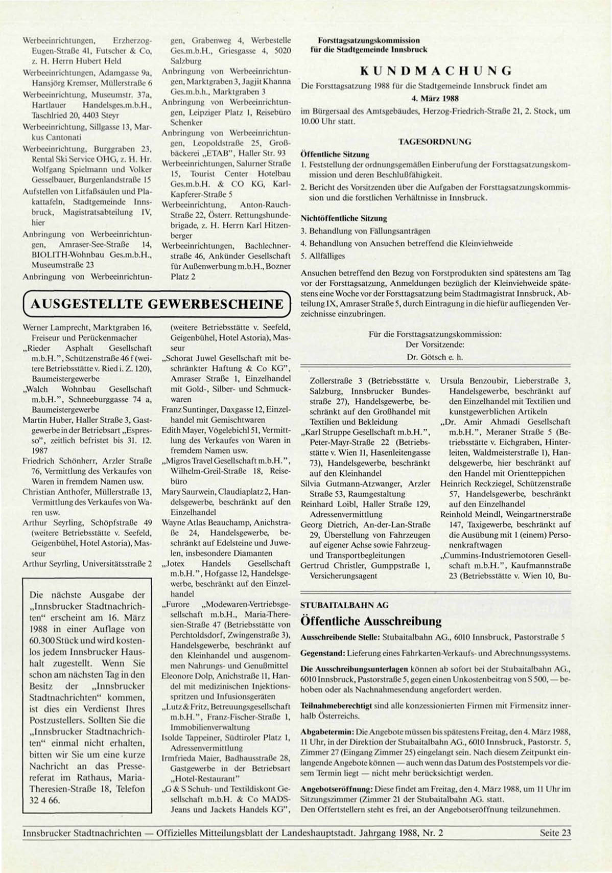 Innsbrucker Stadtnachriehten — Offizielles Mitteilungsblatt der Landeshauptstadt. Jahrgang 1988, Nr. 2