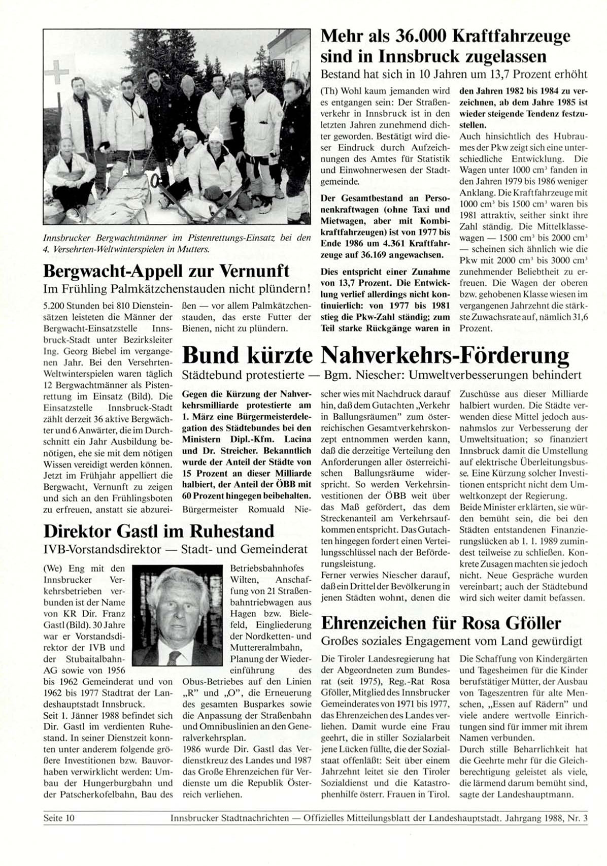 Seit 1. Jänner 1988 befindet sich die Anpassung der Straßenbahn das Ehren/eichen des Landes ver- viele andere wertvolle HnrichDir. Gastl im verdienten Ruhe- und Omnibuslinien an den Gene- liehen. Damit wurde eine Frau tungen sind für iminei mit ihu-m