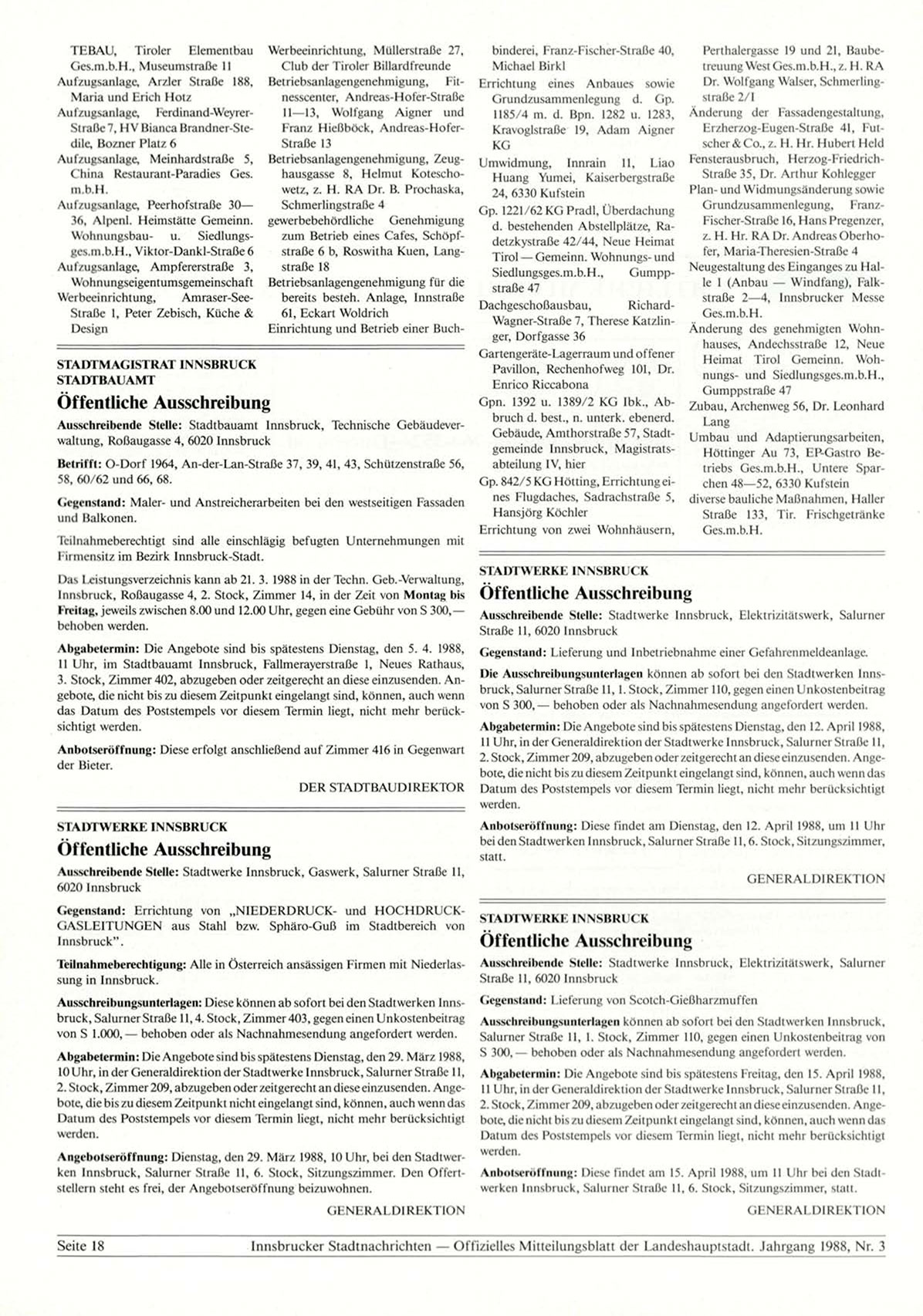 Angebolseröffnung: Dienstag, den 29. März 1988, 10 Uhr, bei den Stadtwerken Innsbruck, Salurner Straße 11, 6. Stock, Sitzungszimmer. Den Offert