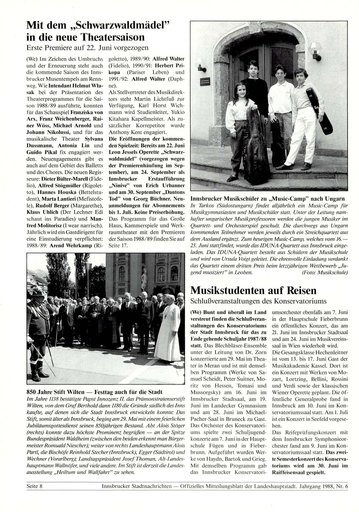 Innsbrucker Stadtnachrichten — Offizielles Mitteilungsblatt der Landeshauptstadt. Jahrgang 1988, Nr. 6