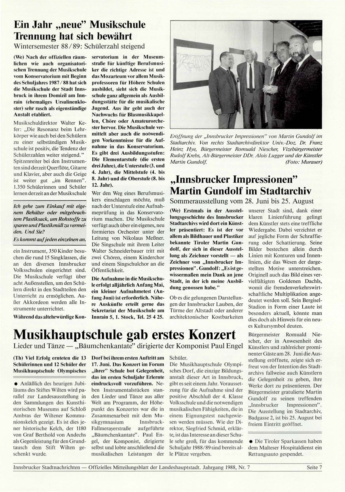 Innsbrucker Stadtnachrichten — Offizielles Mitteilungsblatt der Landeshauptstadt. Jahrgang 1988, Nr. 7