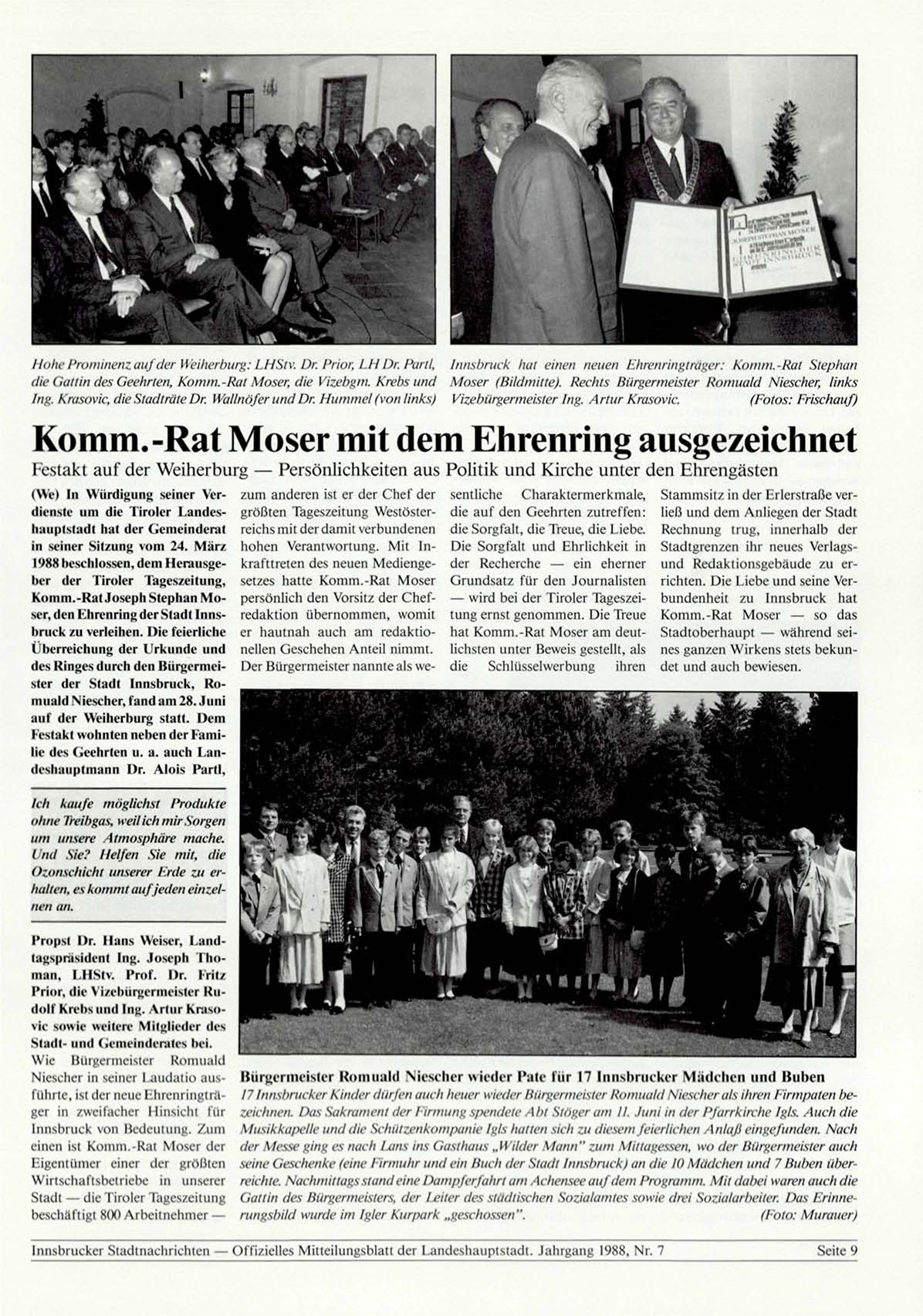 komm.-Rat Joseph Stephan Moser, den Khrenring der Stadt Innsbruck zu verleihen. Die feierliche