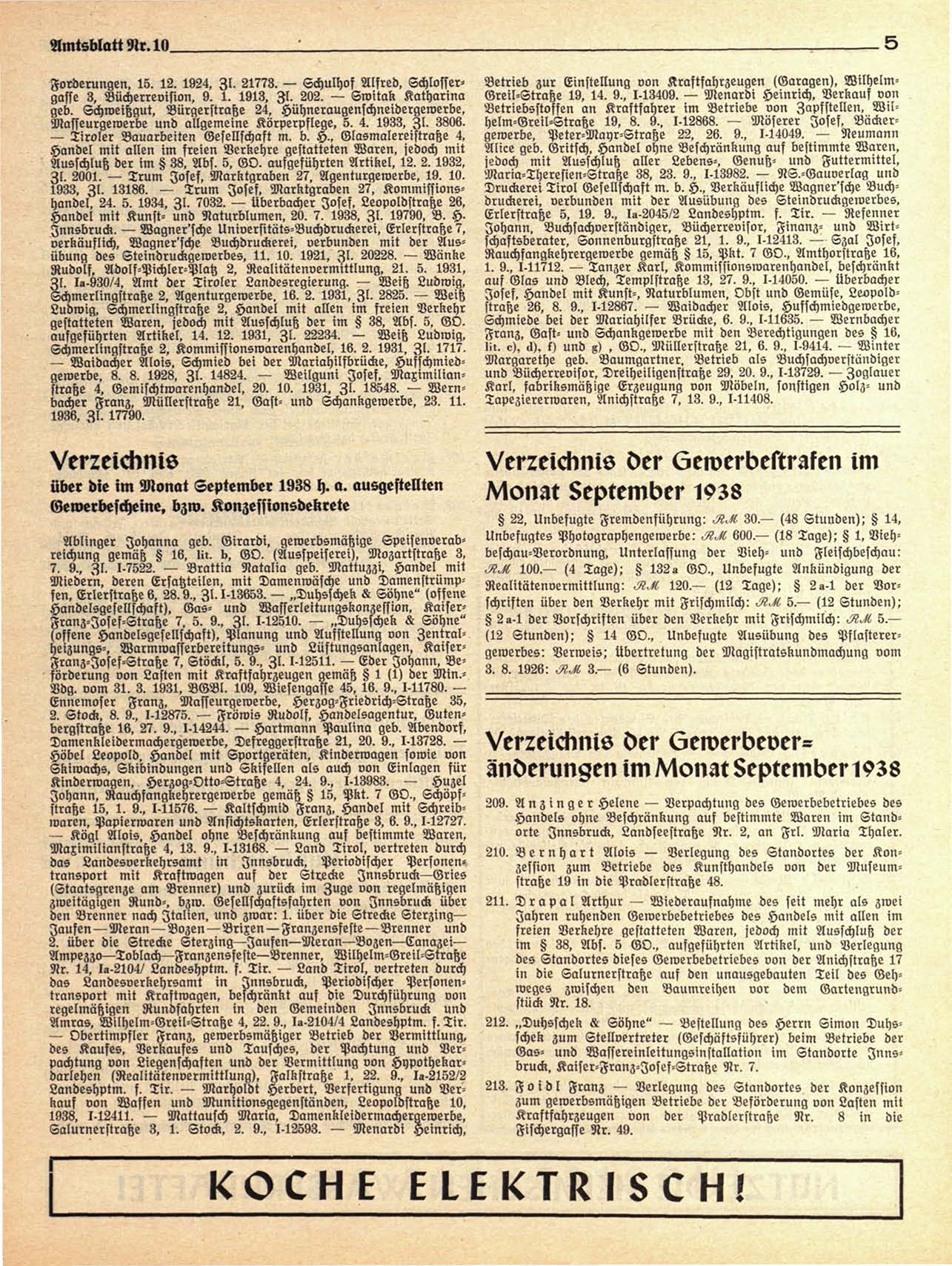 — Waidacher Alois, Schmied bei der Mariahilfbrücke, Hufschmiedgewerbe. 8. 8. 1928, ZI. 14824. — Weilguni Josef, Maximilianftraße 4. Gemischtwarenhandel, 20. 10. 1931. Zl. 18548. — Wernbacher Franz, Müllerstratze 21. Gast- und Schankgewerbe. 23. 11.