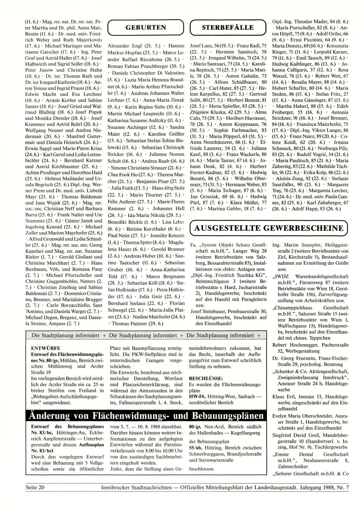 Innsbrucker Stadtnachrichten — Offizielles Mitteilungsblatt der Landeshauptstadt. Jahrgang 1988, Nr. 7